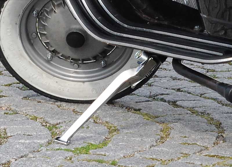 Kleines Update: am Samstag bin ich endlich dazu gekommen, den Seitenständer zu montieren. Aber irgendwie scheint er doch nicht der passende für die PX zu sein. Nachdem eine 6mm Stahlplatte nicht wirklich gereicht hat, um die Feder vom Blech weg zu bekommen habe ich nochmal ca. 6mm mit Beilagscheiben unterlegt. Jetzt gehts gerade so. Nur mit der Stahlplatte hätte der Ständer sicherlich eine Welle in das Blech geformt. Sieht vielleicht ein bisschen abenteuerlich aus, aber wird schon halten.
