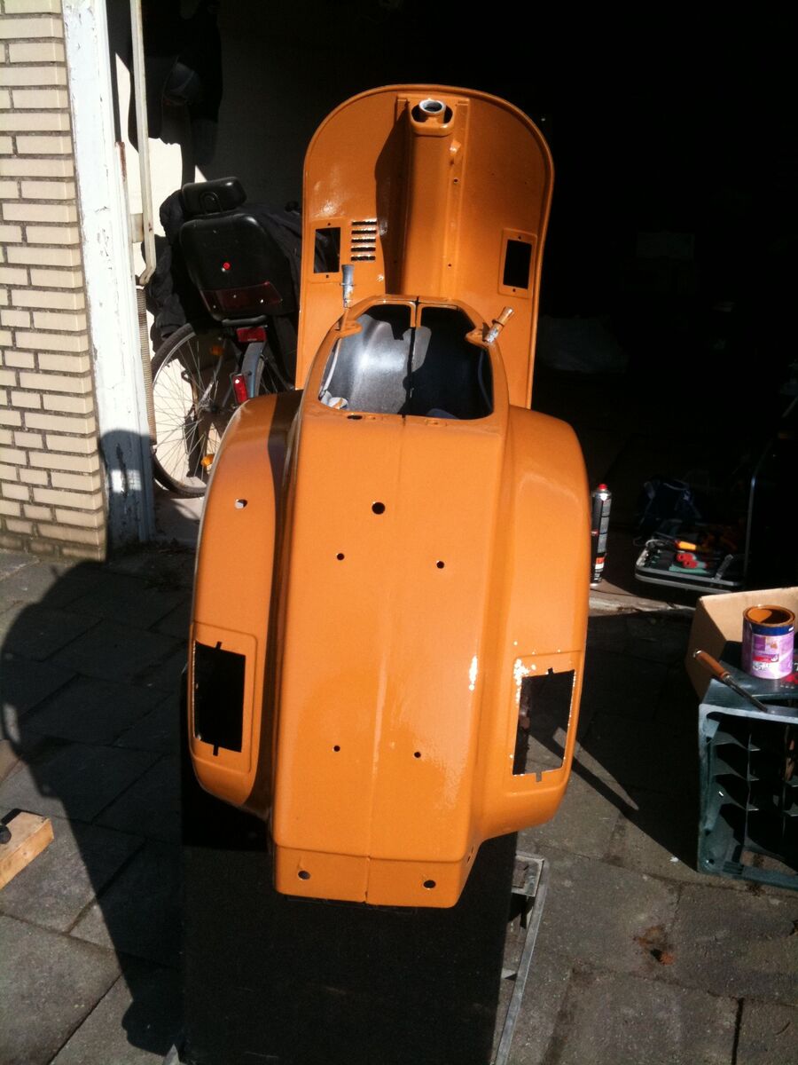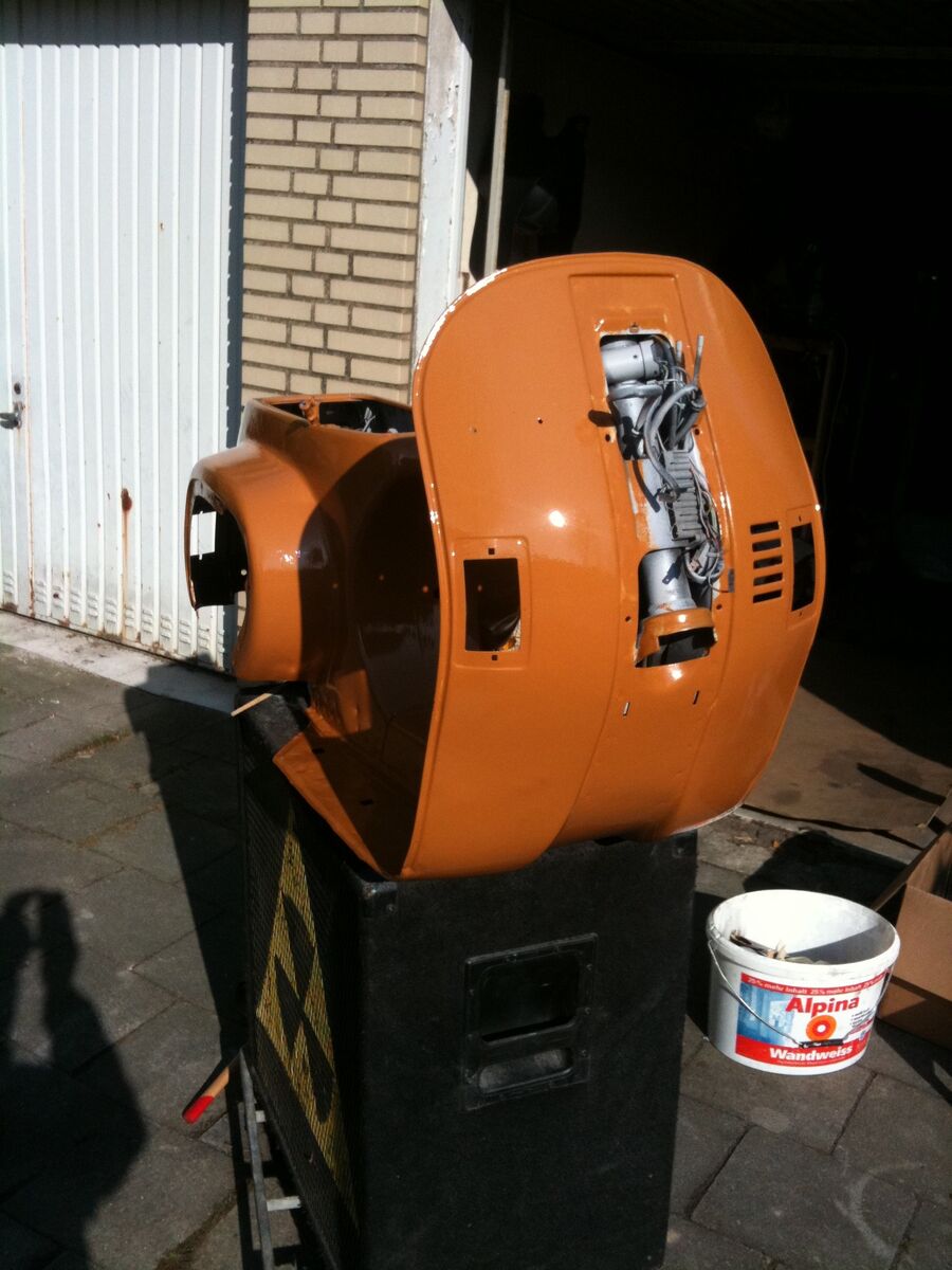 Ich mab mal versucht das Beinschild wieder zu richten, hat aber noch ein paar Dellen, was mich weiterhin nicht stört. Am Wochende wurde grundiert und geschliffen und heute mal die erste Lackschicht aufgerollt. Auf den Bildern ist der Lack noch nass, dadurch wirkt es wie hochglanz. Ist aber ein Mattlack.