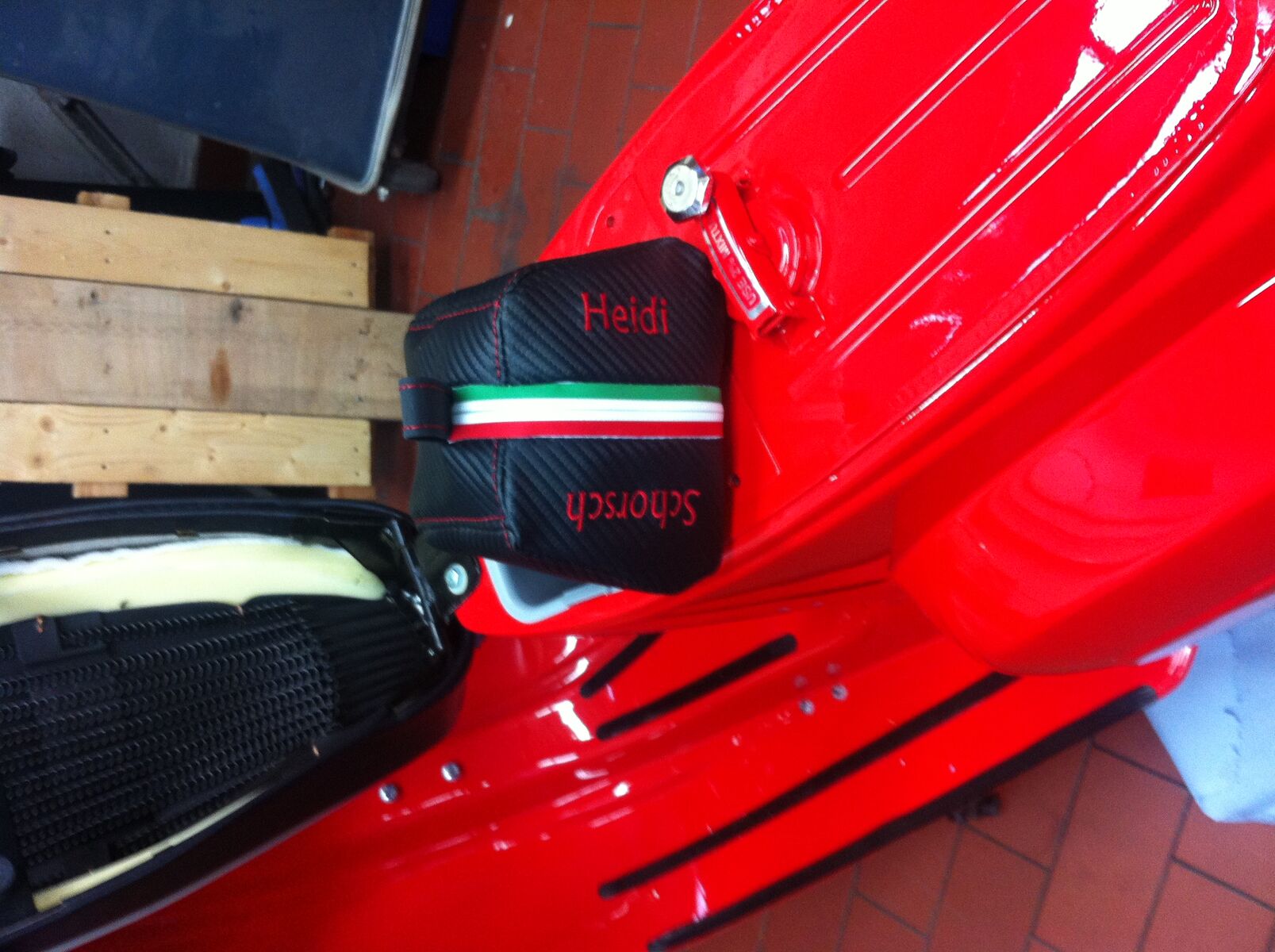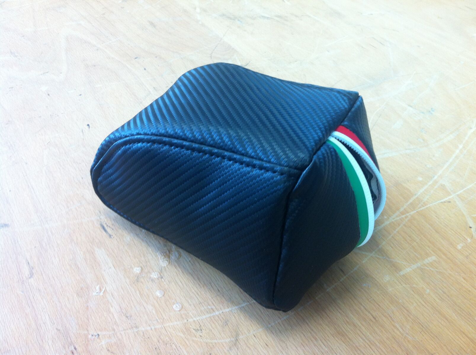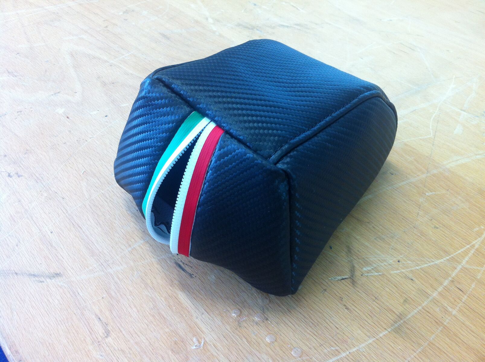Material ist ein schwarzes Kunstleder in "Carbon-Optik", den Tricolore-Reissverschluss hab ich auch noch irgendwo gefunden, passt aber ganz gut zum Thema...