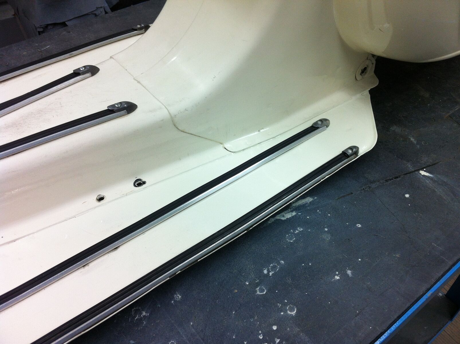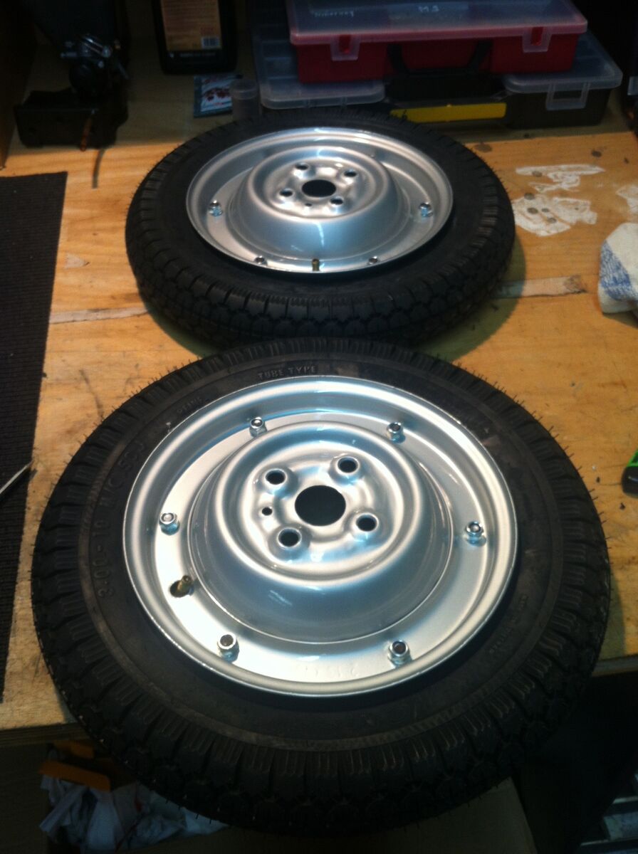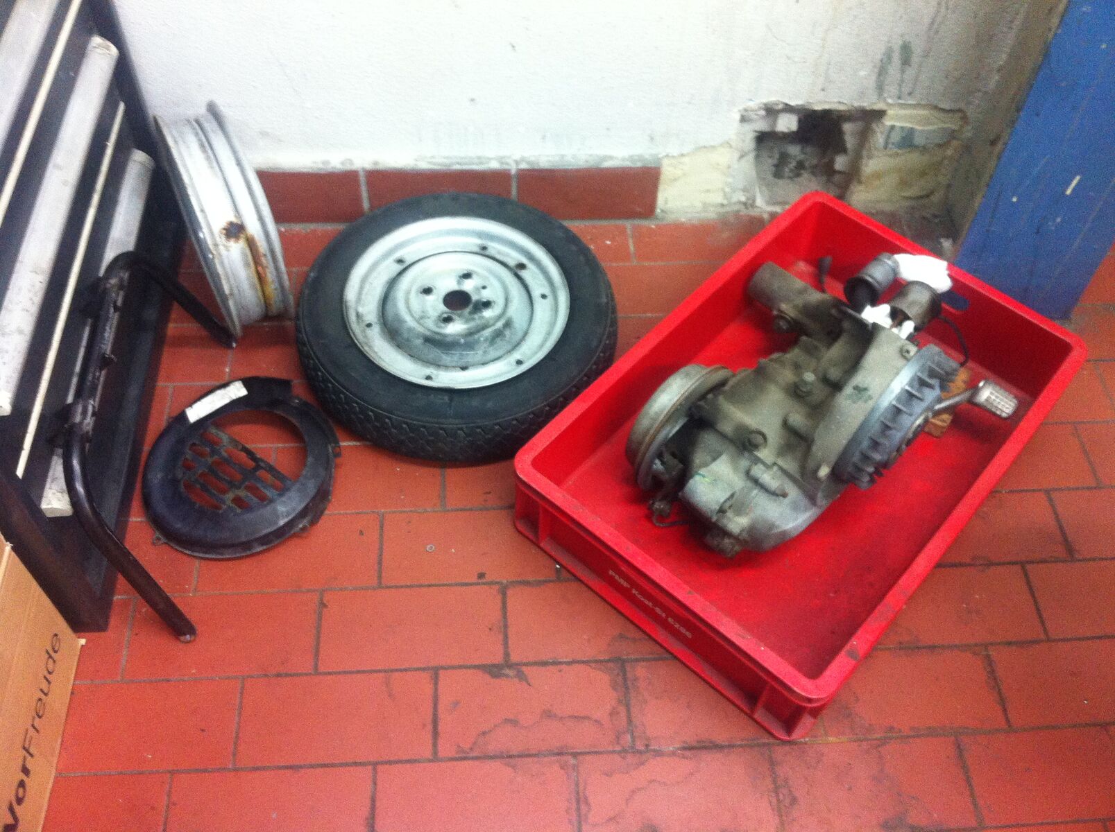 Hab ihn dann so ziemlich komplett zerlegt und geputzt, poliert, eine Stelle am Trittbrett auch nachlackiert (mit pi mal Daumen nachgemischter Farbe von meinem Lackierer). Bremstrommeln, Gabel und Radnabe hab ich selber mit RAL 9006 in meiner kleinen Lackierkabine gespritzt.