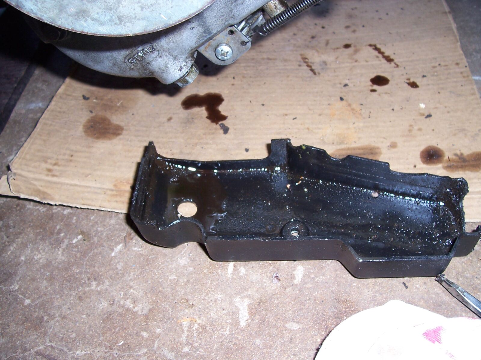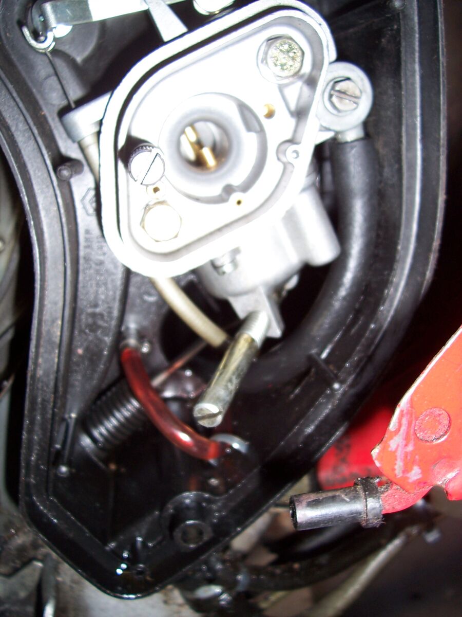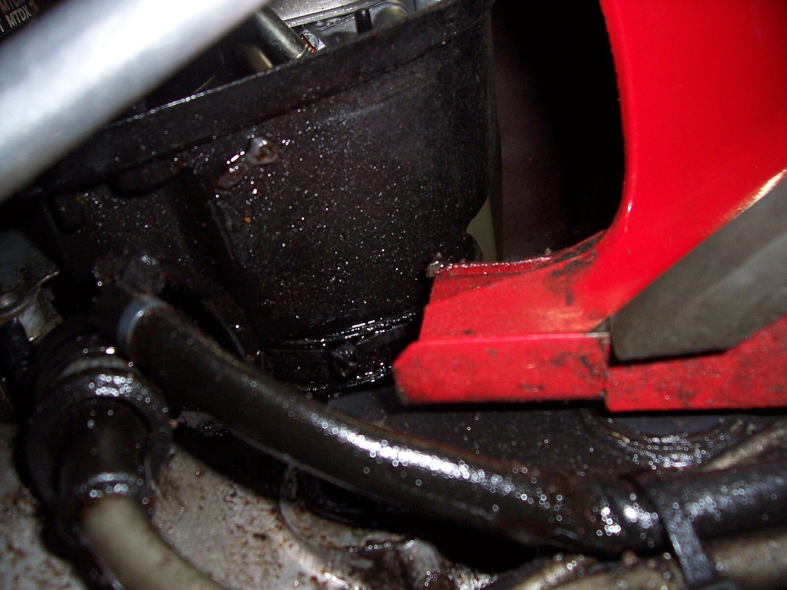 War gerade nochmal nachsehen wie es jetzt nach einer Nacht stehen aussieht an dem Motor. schwarz-rötliche Schmiere auf dem Boden war vorhanden(siehe Bilder). Allerdings ist unter der Ölpumpe kein neues Öl hinzugekommen (noch nciht). Ansonsten kann ich über ölspuren am Motor keine Aussage machen, weil er sowieso komplett mit öl überzogen ist. Am Vergaserkasten war es leicht ölig untendrin, aber nicht so viel, dass es raustropft. Der Schlauch unterm Vergaser ist die Ölzufuhr zum Membranblock oder? Die schwarze Abdeckung hinterm Vergaser ist auch ölig( hab ich auch ein Bild von gemacht).