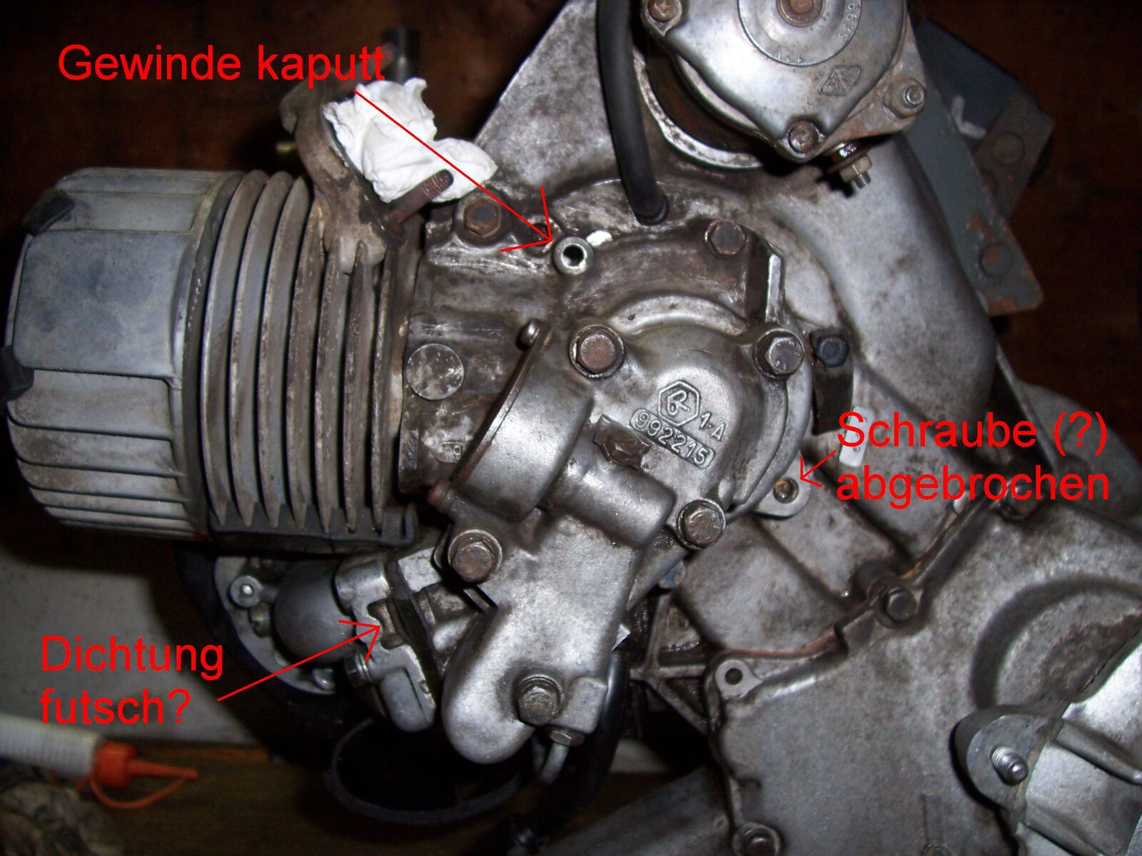 - am Motorgehäuse fehlen zwei Schrauben(siehe Bilder). Einmal ist das Gewinde mit der Schraube zusammen rausgekommen(die eh schon nur halb drin war) und in dem anderen Loch steckt irgendwas drin, hat aber Spiel.