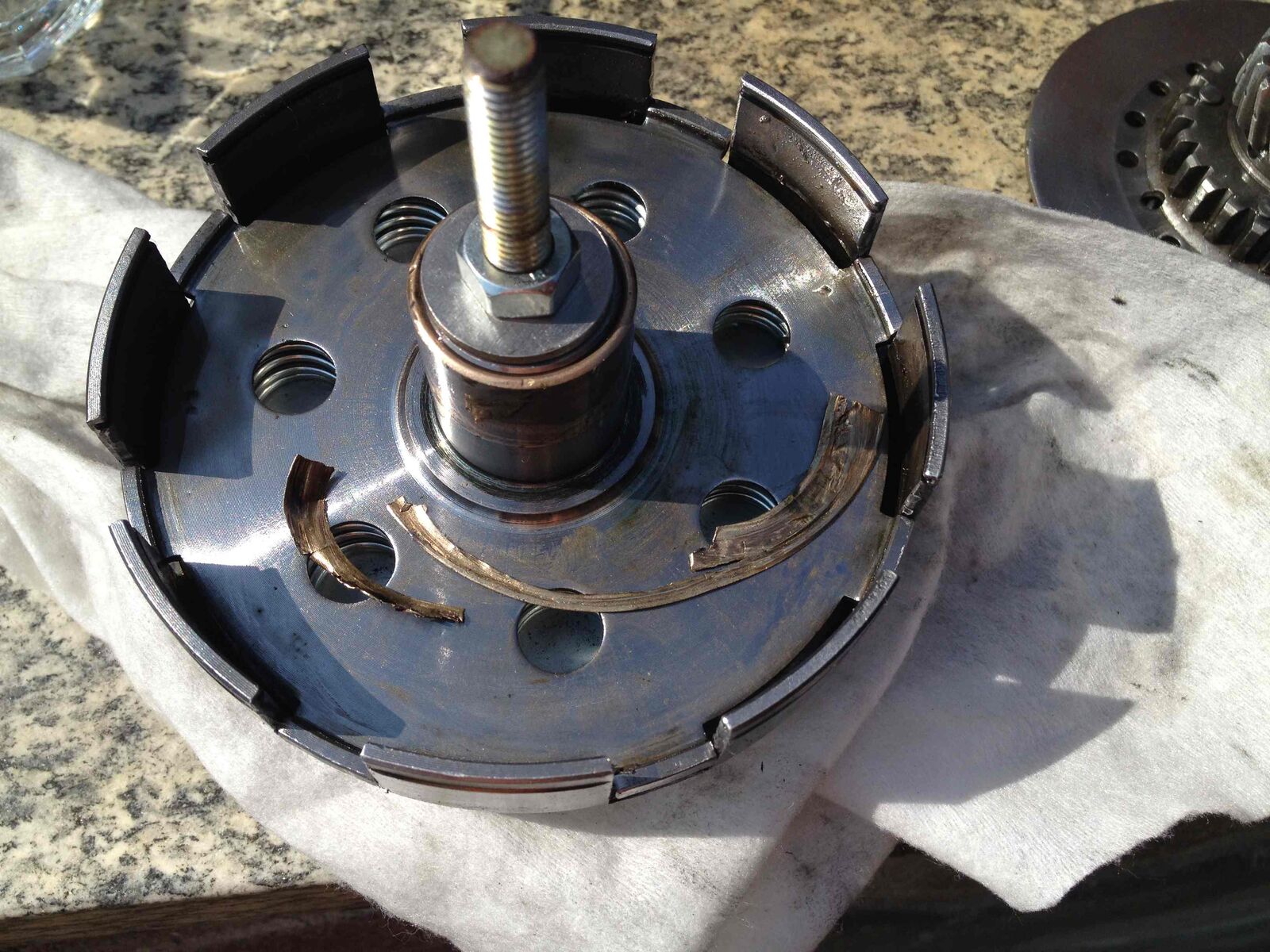 Die Anlaufscheibe in der Kupplung, diese dünne Messingscheibe zwischen Ritzel und Feder-Platte, ist nach zwei, dreimal anfahren völlig zerrieben und damit beginnt das gehoppel, Drehzahl 2-3000 U/min. Im Stand eingestellt (Kicker rutscht je nach Hebelstellung) und funktioniert einwandfrei.