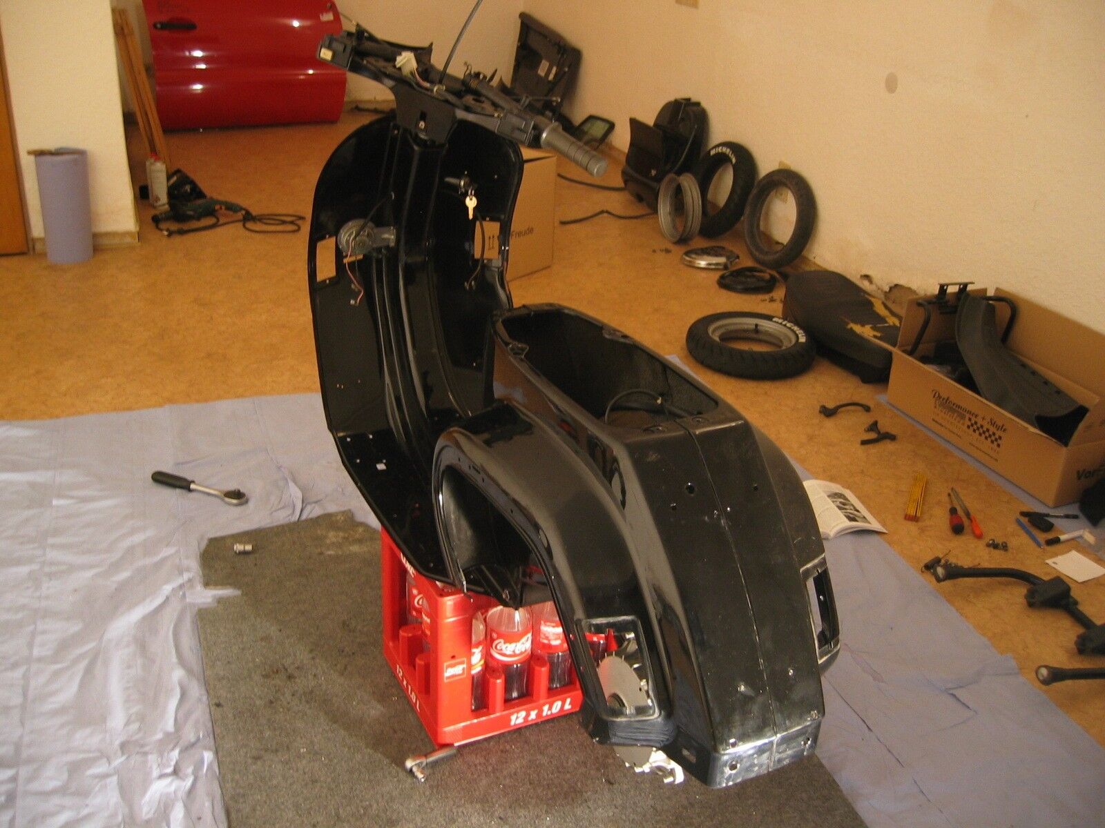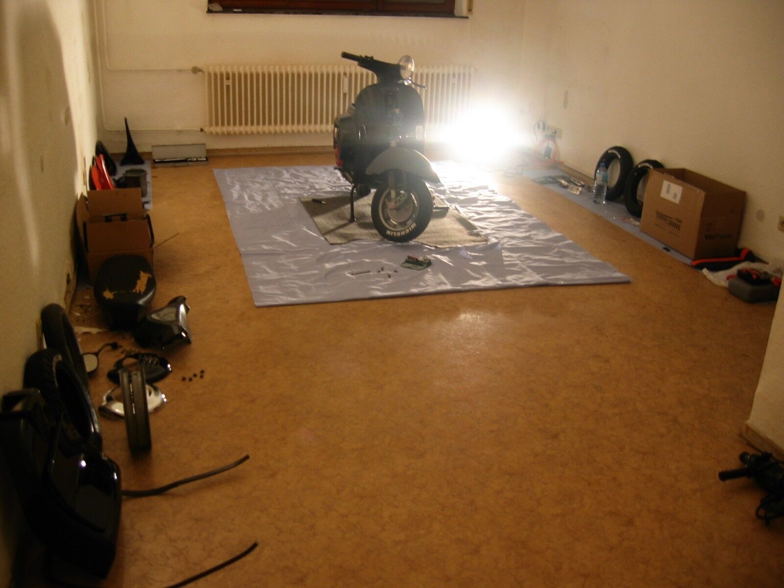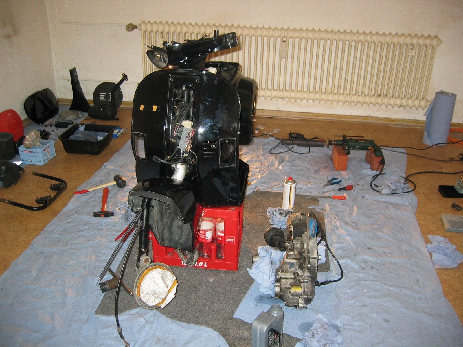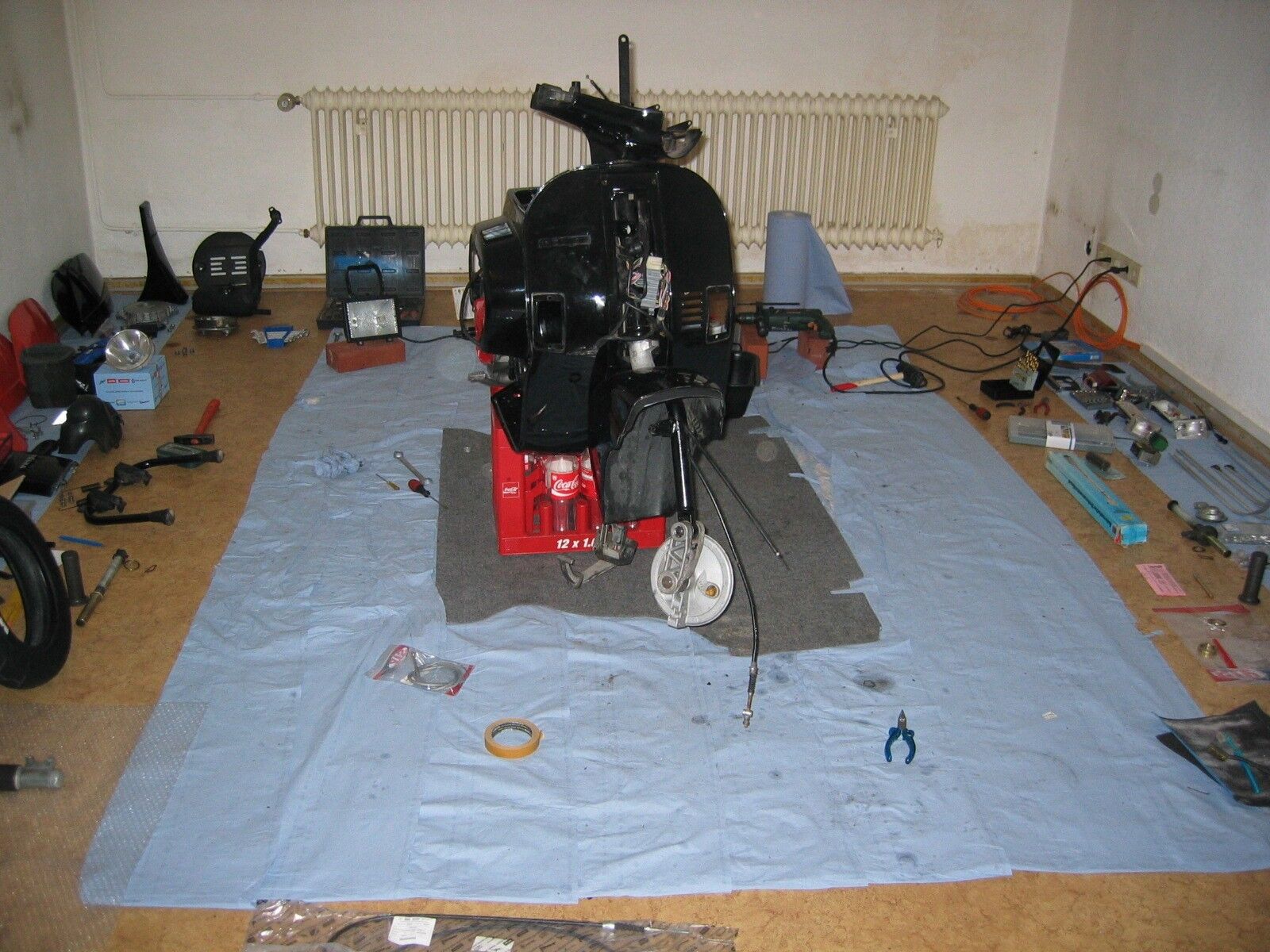 So nun ab in den Keller mit der Vespa und zerlegen bis auf die letzte Schraube (Die Colakiste dein Freund und Helfer
