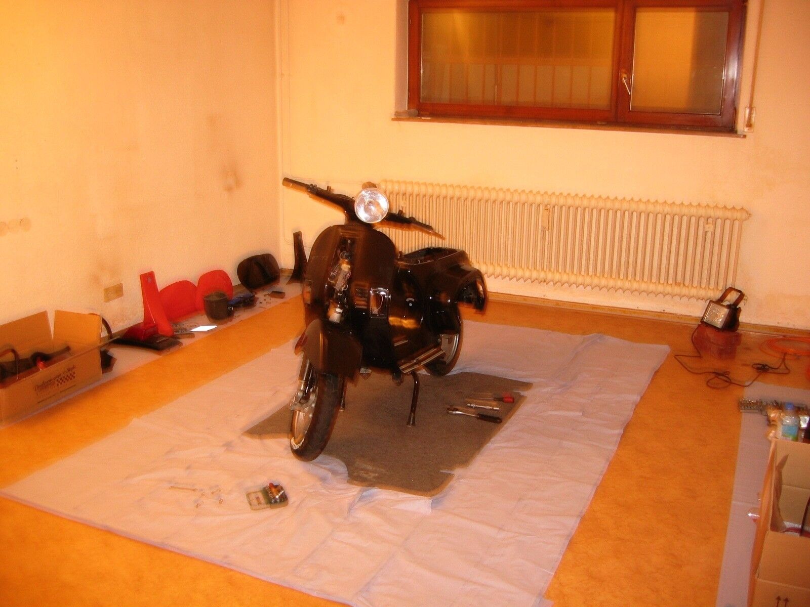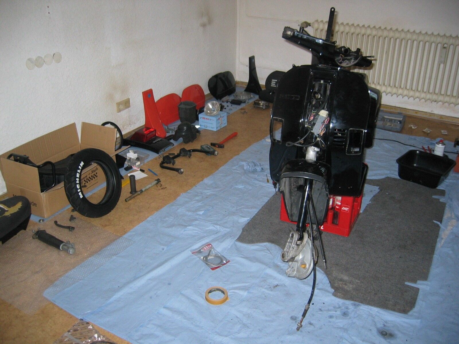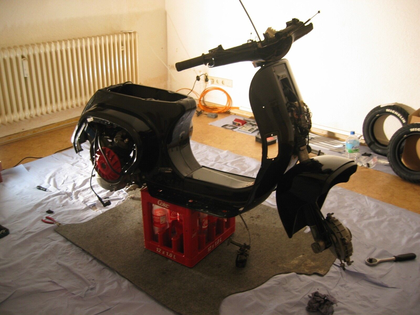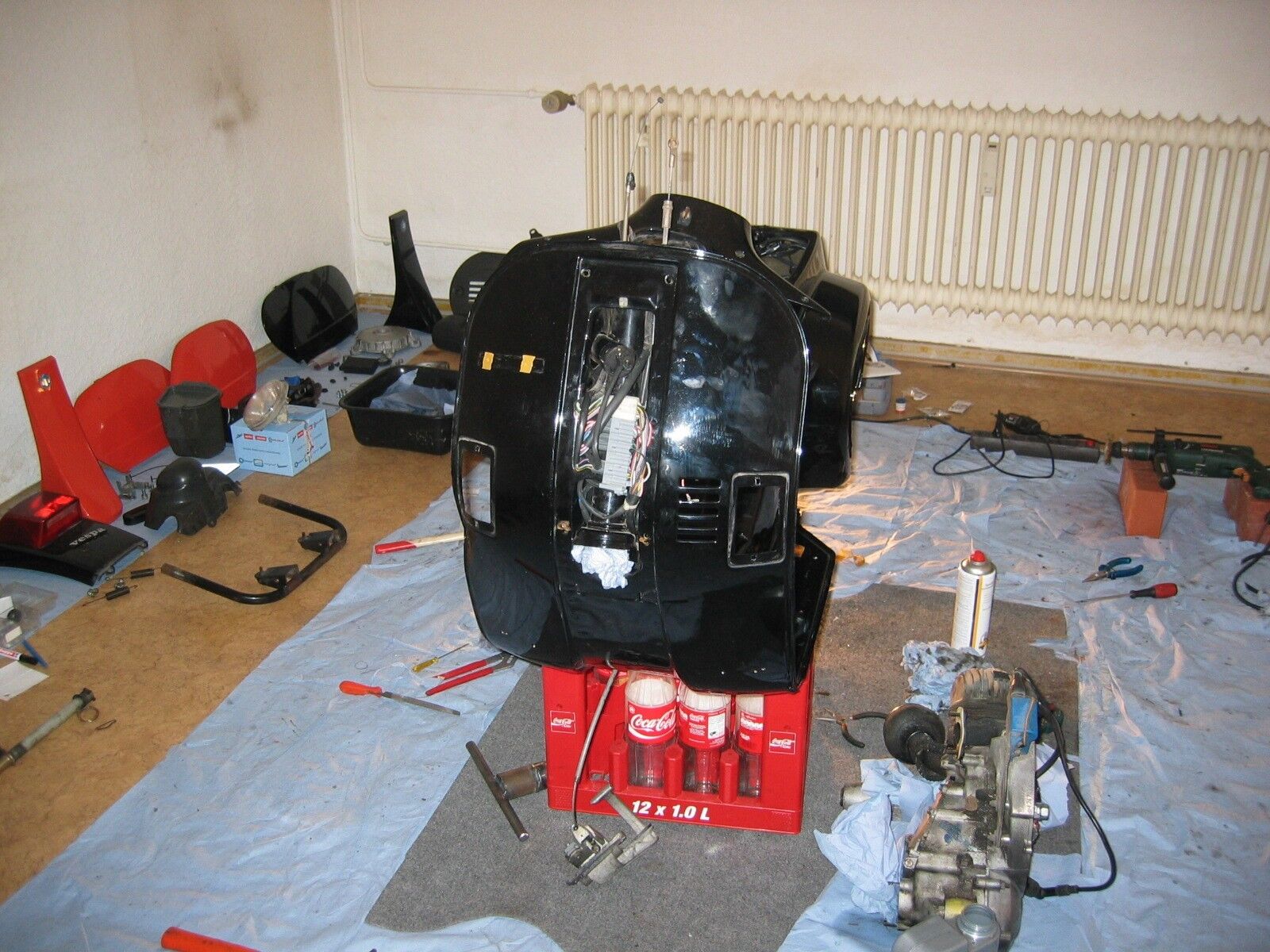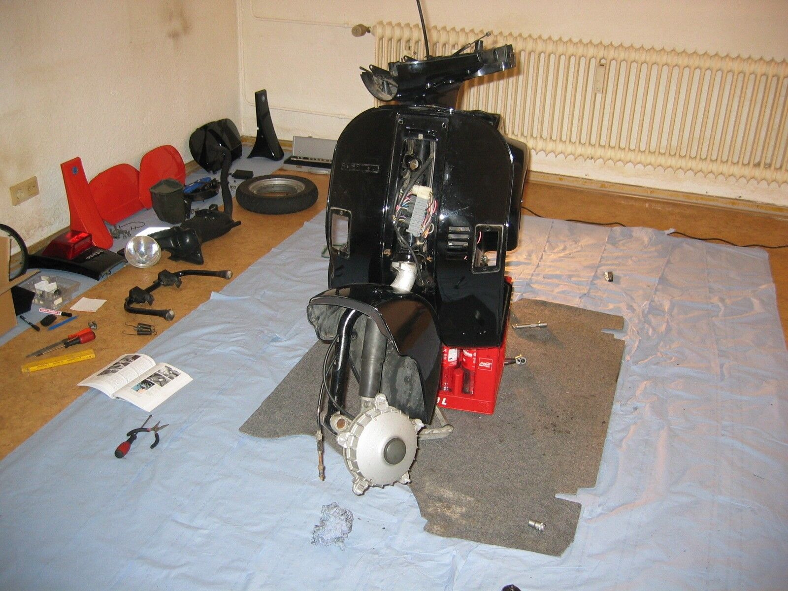 So nun ab in den Keller mit der Vespa und zerlegen bis auf die letzte Schraube (Die Colakiste dein Freund und Helfer