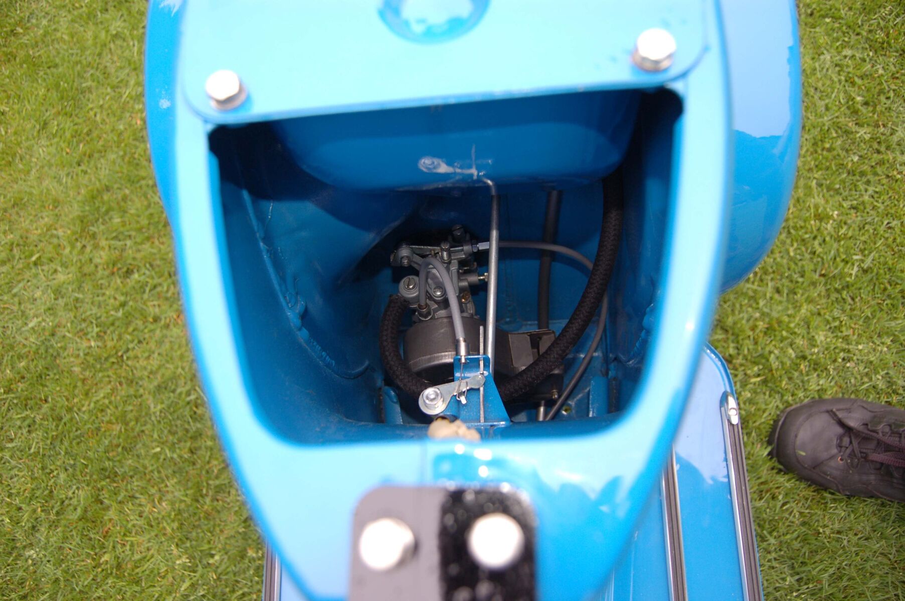 Aber zurück zur Sache, der Schlauch kommt seitwärts aus dem Benzinhahn, Richtung Seitenwand. Was für ein Schlauch ist da verbaut? Da sollte Treibstoffleitung verbaut sein, mit 7,5 mm innenweite. Der Schlauch wird dann auf der linken Seite nach vorne geführt, und im Bogen unter der Stange des Benzinhebels durch, zurück zum Vergaser. Siehe Bild. -