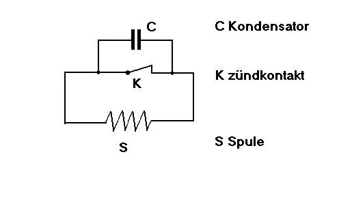 Der Kondensator hat die Aufgabe den Abreißfunken zu löschen. Dieser Funke würde den Kontakt sonst in kürzester Zeit duch Abbrand zerstören. Zur Wirkungsweise; in der Spule wird durch die Magnete Strom erzeugt, (hier vereinfacht ohne Verbraucher dargestellt) beim Öffnen des Kontaktes, unter Stromfluß, würde ein Lichtbogen ( Funke ) entstehen, welcher jedes mal etwas vom Kontakt abträgt. Um das zu verhindern, wird ein Kondensator parallel zum Kontakt gelegt.