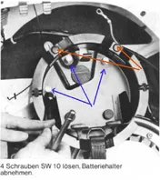 Hi die Sache ist ganz einfach, Batterie ausbauen und Batteriehalter abschrauben (drei Schrauben BLAU) Dann den Batterie- Ersatzrad-Halter in das Ersatzrad legen, rumdrehen und Federringe und Muttern auf die Bolzen (ROT) schrauben Nun den Halter mit Rad wieder an die Vespa schrauben, nur noch Batterie einsetzen, anschließen, Deckel drauf und FERTIG.