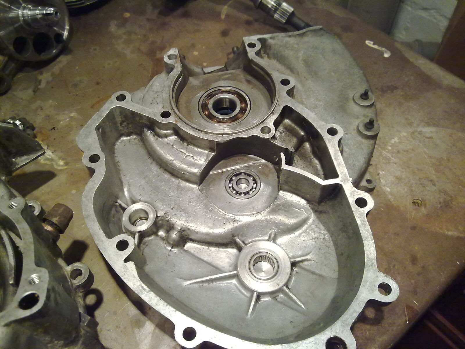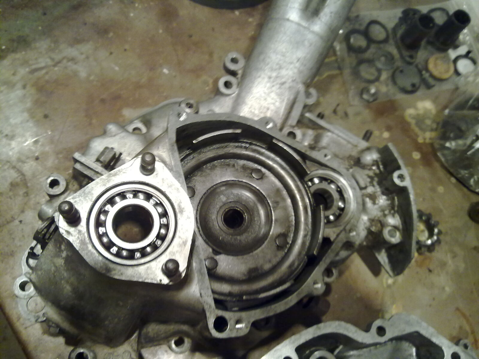 Der Motor war von gemeinen, gefühlten 15kg schweren Dreckklumpen in Gefangenschaft gehalten, wurde vorsichtig befreit (ja, es hätte auch einfachere Methoden gegeben...) und gespalten.