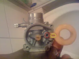 Da wo der rote Kreis ist, sitzt die Schwimmernadel (muss dicht sein) und wird in den Schwimmer eingehakt (grüner Kreis). Der sollte auch dicht sein.