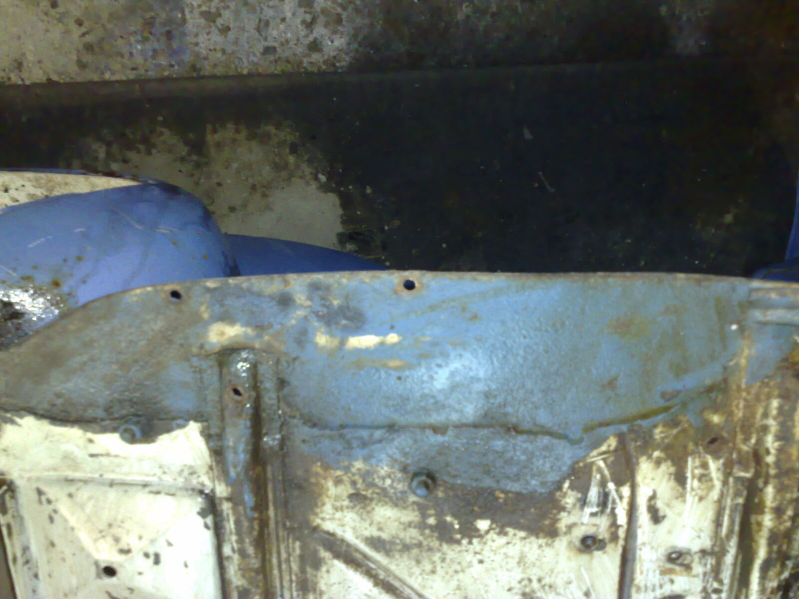 Das erste Bild zeigt das Blech von unten. Das Blaue ist das verschraubte Stück. 2te Bild näher dran und das dritte von oben. Hoffe es hilft ein wenig.