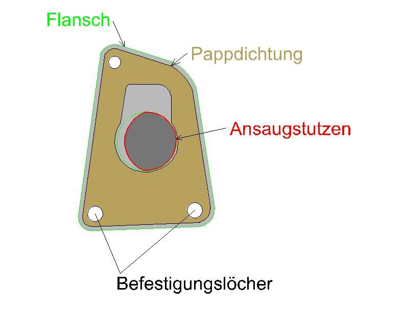 Beim Ausbau des Ansaugstutzens an meiner PK 50 XL2 habe ich festgestellt, dass das aufgeschweisste Rohr am Halteflansch, der mit dem Motorblock verbunden wird mit nicht ganz so passen erscheint wie ich mir das vorstelle. Anhand der Pappdichtung passt die Öffnung des Motorblocks aber eins zu eins.
