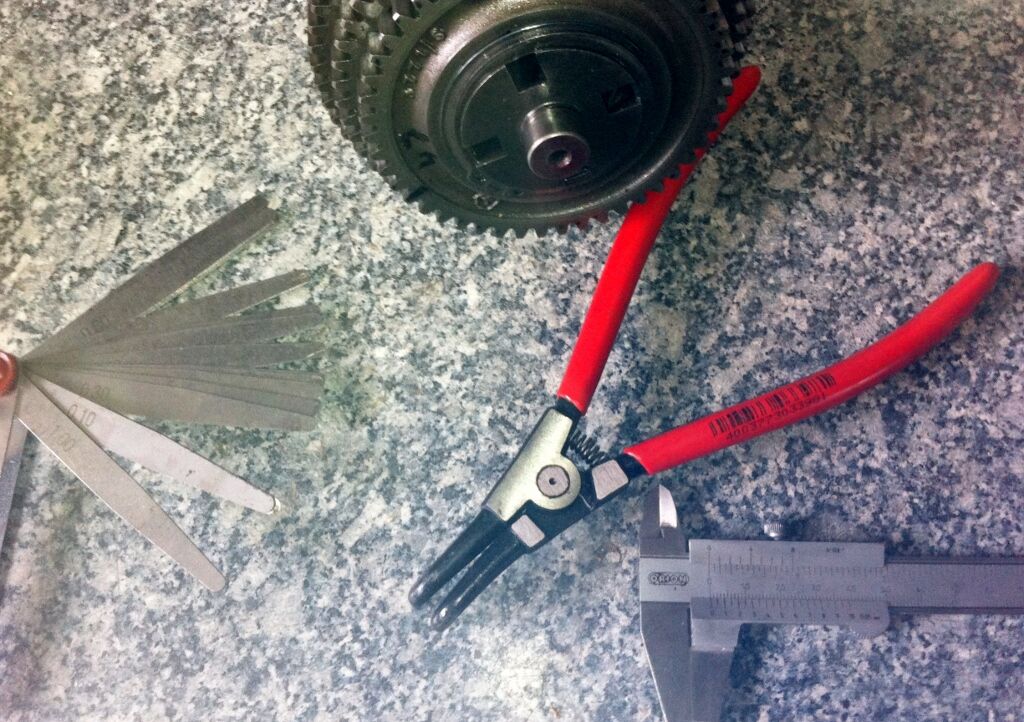 7. Neuen Schulterring rein. Die gibt es in 0,1mm Schritten zu kaufen bis 1,5mm, als Kostengünstige Alternative gibt es anlaufscheiben ab 0,1mm für nen paar Cent. Bei älteren Getrieben gehen fast immer 0,2mm rein.