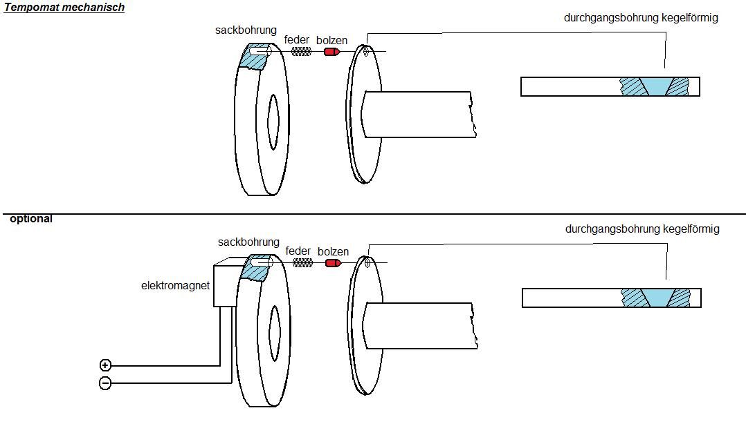 um ihn "endrasten" muss man ihn nur wieder drehen.im unteren bild sicht man die sicherere variante, hinter der sackbohrung is ein elektromagnet angebracht, welche einfach an die bremse angeschlossen ist, dafür ist ein bremslicht, oder ein bremslichtschalter von nöten. wird also die bremse betätigt fließt der strom in den magneten und "endrastet" den bolzen: der gasgriff schnell auf seine nullstellung zurück.