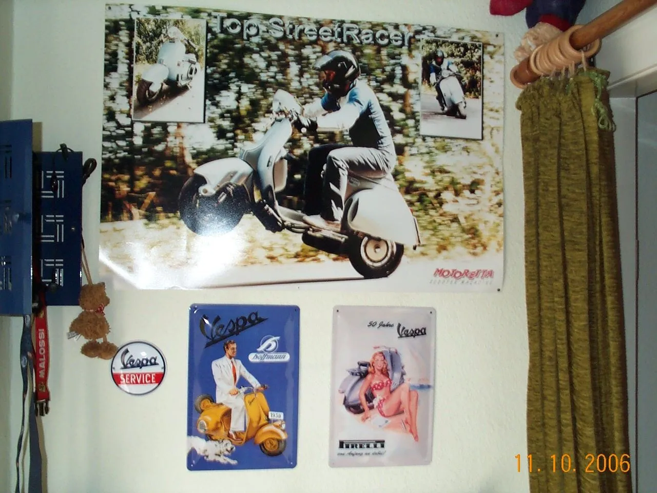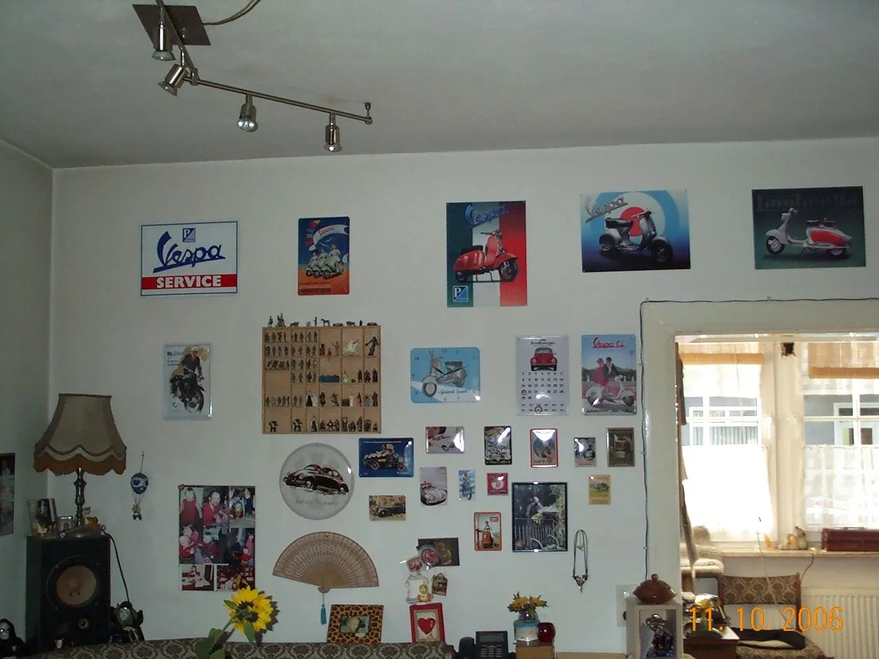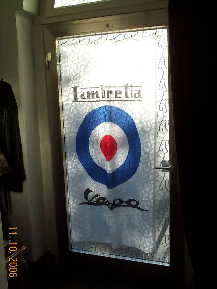 Die Schaukelvespa habe ich zur Hochzeit bekommen,die Fahne gab es bei Ebay und überall im Wohnzimmer habe ich Blech- und Emallieschilder. -