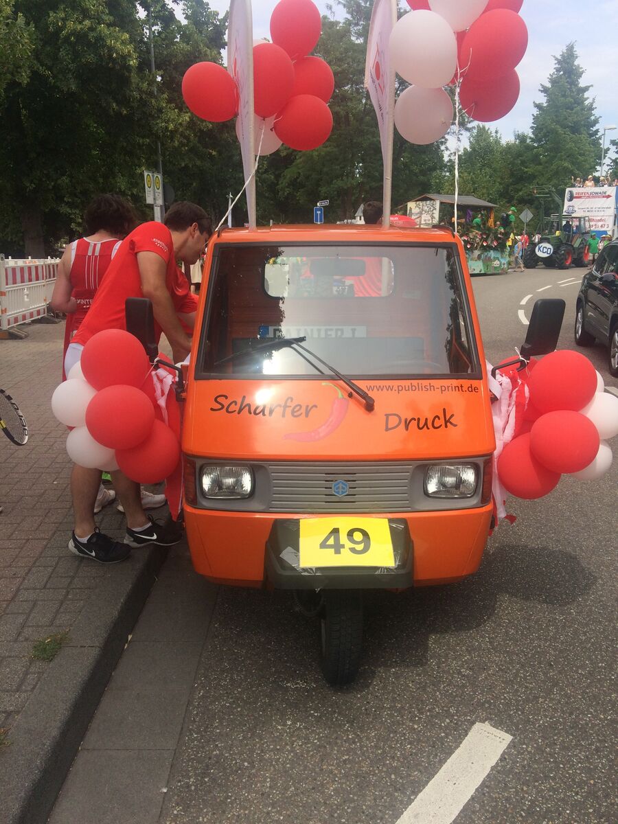 Gestern auf dem Weg zum Bretzel Fest Umzug in Speyer habe ich einen alten Bekannten getroffen der hat mich gefragt ob ich bei seinem Verein mitlaufen würde, sie wären nicht so viele. Da ich etwas lauf faul bin, habe ich zu Ihm gesagt laufen nein, aber die APE würde ich fahren. Kaum habe ich das zu Ihm gesagt sah’s ich in der APE und durfte den Umzug mit fahren. Ich hatte einen riesen Spaß.