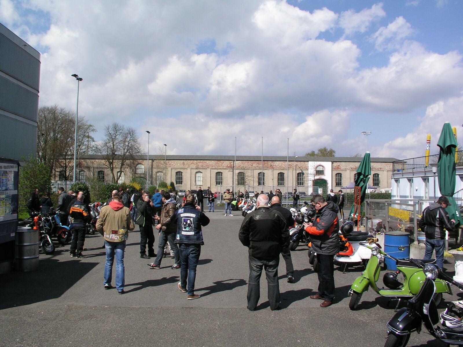 Nächster Zwischenstopp war der 15km entfernte Ort Neersen, wo wir mit unserem alten Freund Markus und seiner PK aus Mönchengladbach verabredet waren, bevor es dann geschlossen weiter zu unserem Ziel in Kempen ging. Ein wenig zu schaffen machten uns doch immer wieder aufkommende (oder zurückkehrende?) Windböen, die uns manchmal zu Schlangenlinie fahren verleiteten und außenstehenden Personen den Eindruck vermittelten: Haben die gesoffen? (Antwort: NEIN …. Noch nicht!) Gegen 10:40 waren wir dann, nach einem kurzen Tankstopp, am Ziel …… und wurden dort herzlich von André, Stefan und anderen bekannten Gesichtern in Empfang genommen.