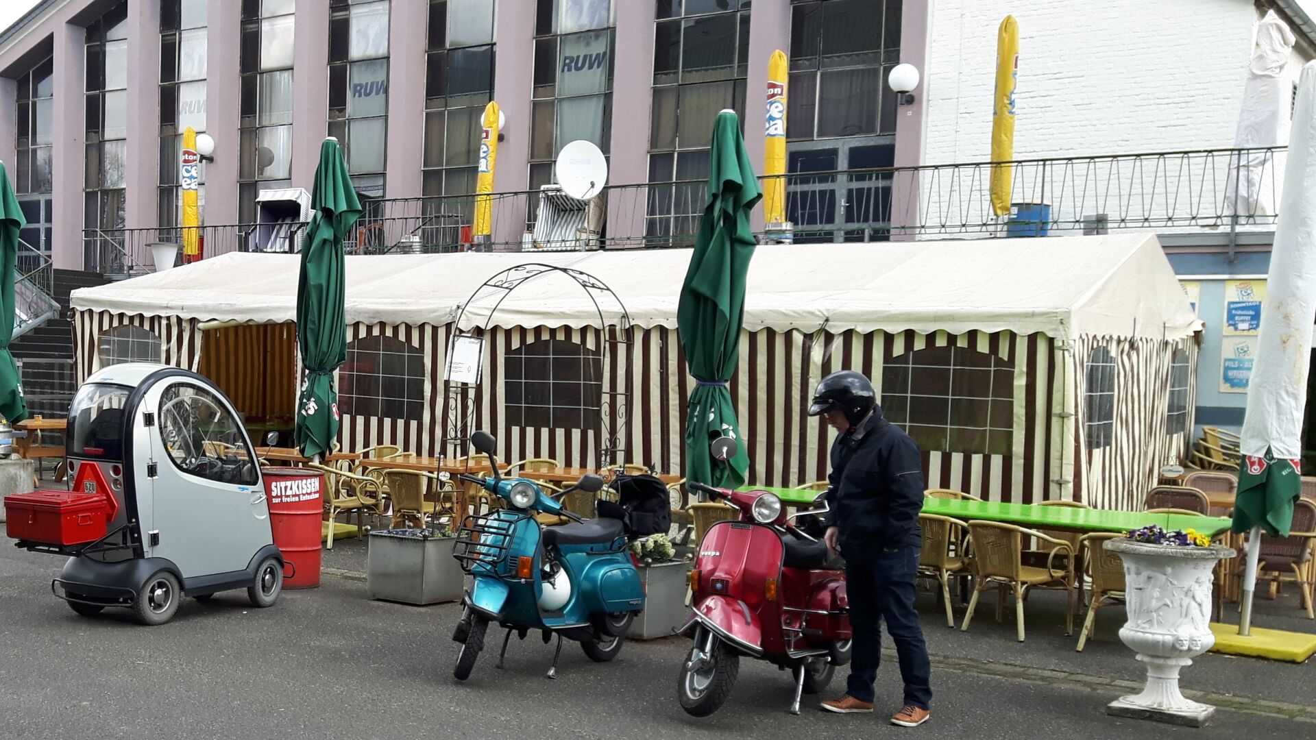 Und welche Überraschung, hier warteten, im Gegensatz zu den letzten Touren, 2 Vespitis mit ihren PK´S; nämlich unser alter Aachenbegleiter Chris und einer der sich mal getraut hat, unserer Einladung zu folgen; herzlich willkommen: “Ivo“. Hier kann man mal sehen, wie groß unser Einzugsgebiet ist