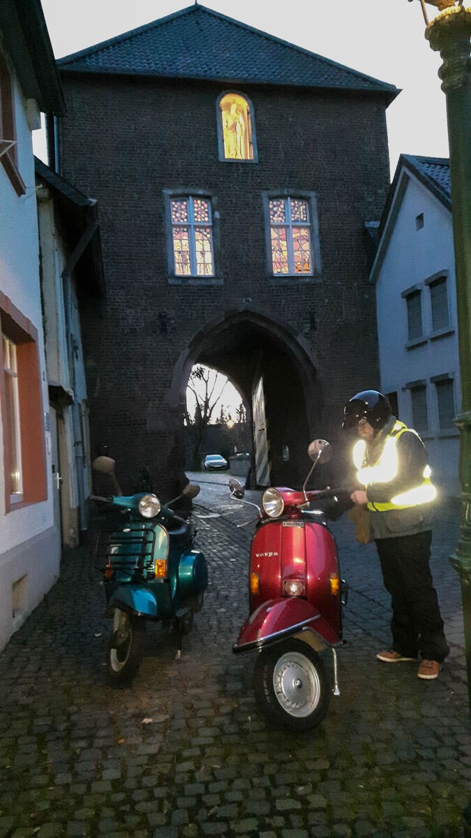 Bei strahlendem Sonnenschein haben Oswald und ich uns, gut gelaunt, zum Treffpunkt nach Krefeld aufgemacht, wo wir uns mit Stefan, Andrè und 12 weiteren Vespaliebhabern des VTC-Kempen bei Mo‘s Bikertreff verabredet haben um gemeinsam den Kempener Weihnachtsmarkt zu erkunden.