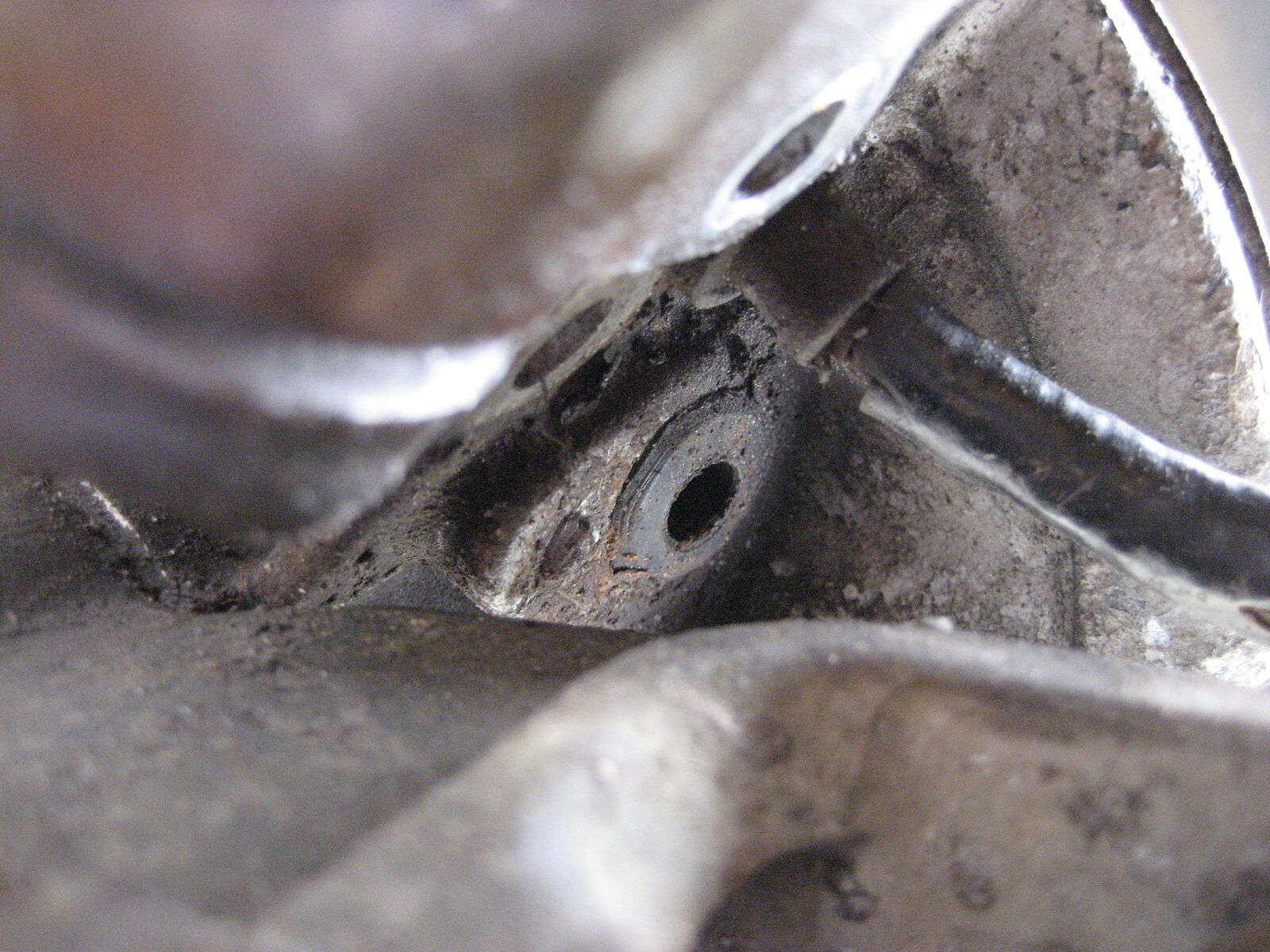 Ich komme mit dem Bohrer allerdings nicht dran, weil das Rohr vor dem Stoßdämpfer im Weg ist. Die zwei Schrauben des Stoßdämpfers habe ich bereits gelöst und die Schwinge, wenn das Ding so heißt, herunter gedrückt.