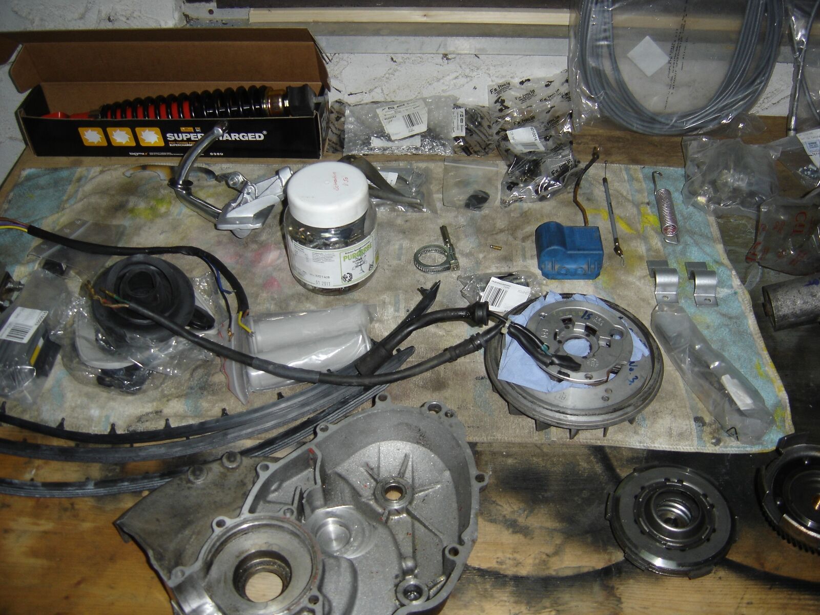 So langsam ist der benötigte Teilehaufen komplett. Muss noch ein Loch an der LiMa-Seite schweißen lassen und dann kann's fast los gehen mit dem Zusammenbau. Der Motor wird noch glasperlgestrahlt, das eine oder andere noch poliert und aufbereitet.