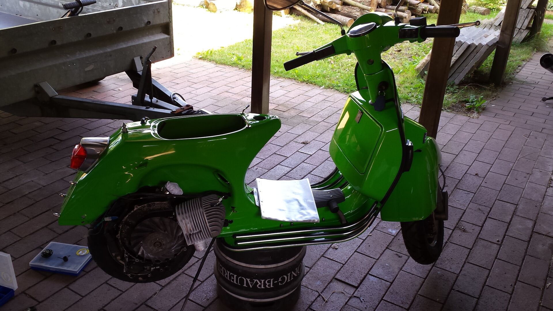 Motor wieder ausgebaut, zerlegt, Ersatzteile gekauft und dann irgendwie davon abgekommen. Nun ca. 12 Jahre später soll das Projekt wieder aufleben. Fehlende Komponenten sind bestellt, demnächst beginnt der Zusammenbau. Und dann werden in einem neuen Thread auch meine Fragen kommen, z.B. zur Identifizierung der Kurbelwelle und des Resonanzauspuffs, welchen Zylinderkopf soll ich nehmen (damals war ein original Vespa-Kopf verbaut), auf welchen Wert stelle ich die Zündung ein, wer kann mir später bei der Vergasereinstellung helfen, u.s.w.