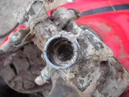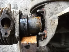Dann spannst du den Deckel genau wie auf dem Foto in den Schraubstock, aber total vorsichtig und nicht zu fest, die Messingbuchse verhindert, dass sich die Achse dreht, und so kannst du den Hebel aus seinen Sitz bewegen