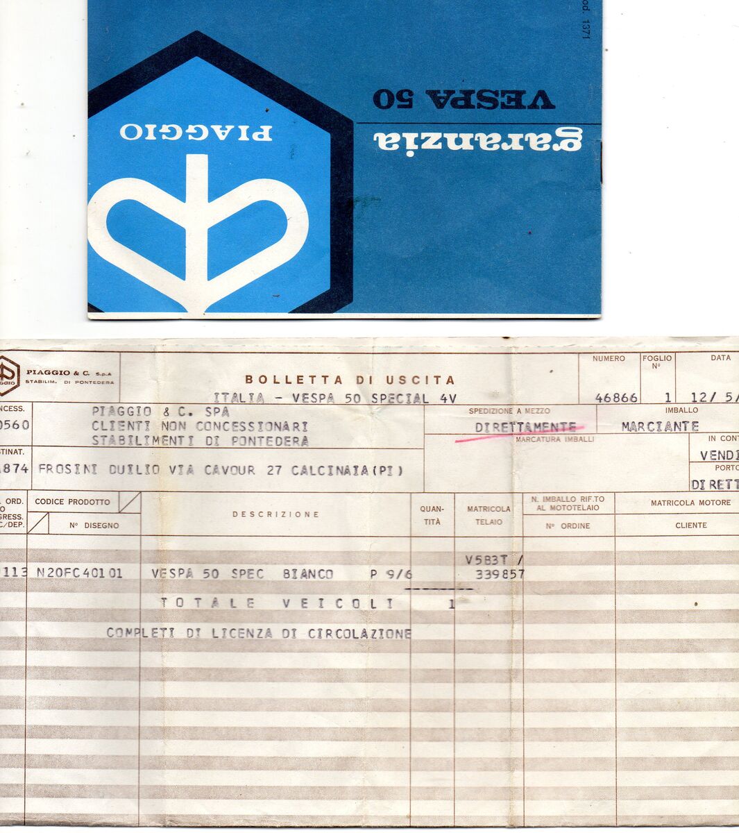 Heute durfte ich eine Special in O-Lack bianco spino P 9/6 zu meiner Sammlung hinzufügen, und tatsächlich war in der Werkzeugtasche neben den originalen Maul- und Zündkerzenschlüssel noch die Papiere für die Garantie und Kundendienste und das Auslieferungspapier vom Werk in Pontedera nach Calcinaia Pisa- alles von 12.5.1980....ein schönes Stück Geschichte , und das erste Mal, dass solche Papiere bei einer meinigen Vespas dabei waren. Vielleicht hat noch jemand anders vom Forum solche seltenen Schmankerl- ich grüße und wünsche weiter Gutes Gelingen