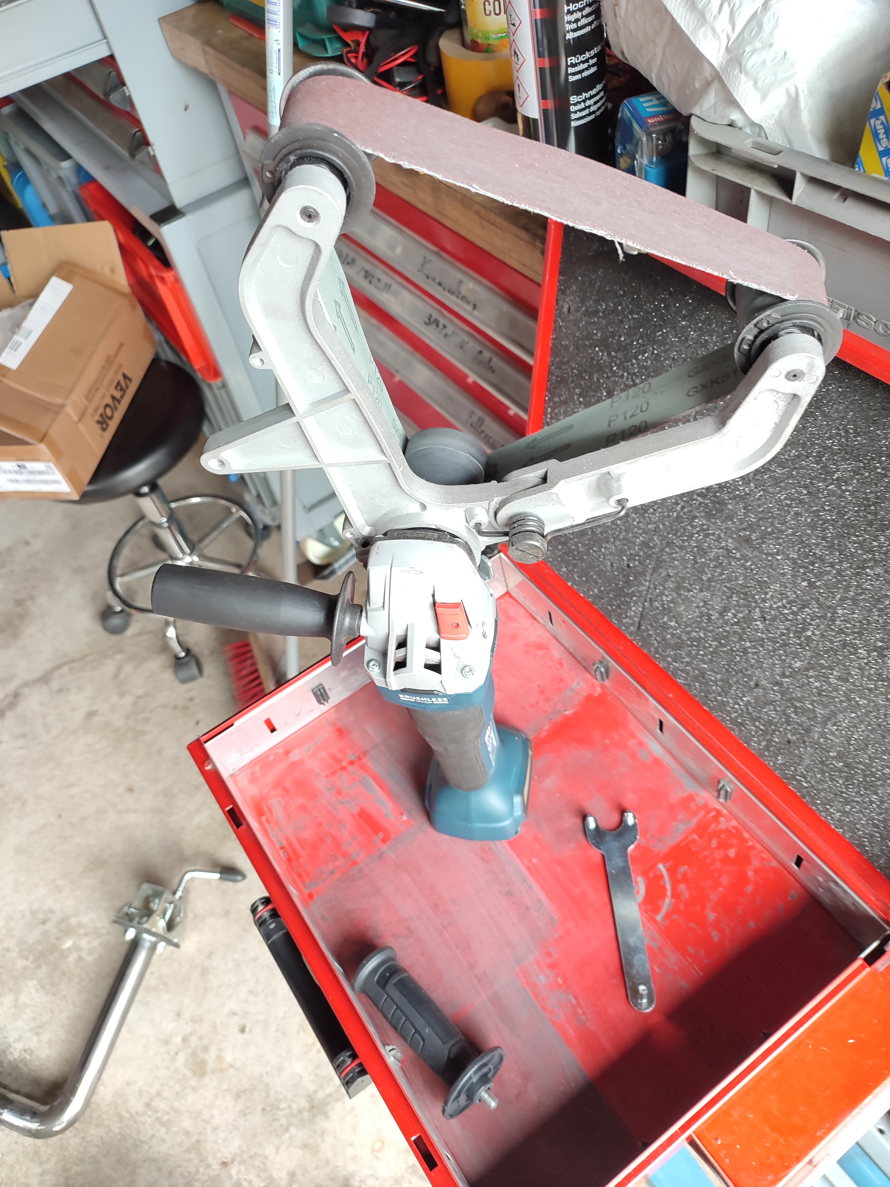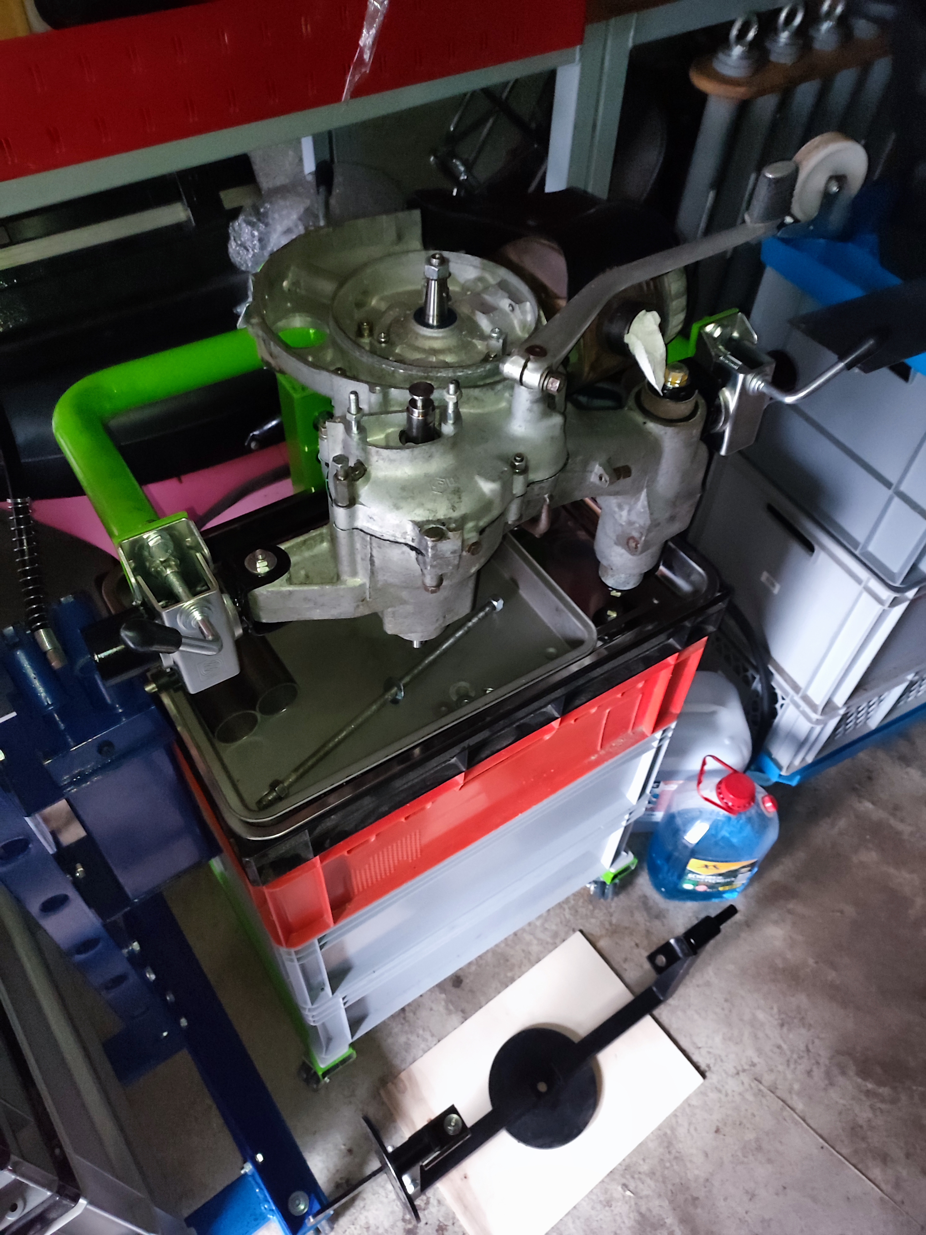 Funktioniert...hab aber jetzt schon wieder Verbesserungen im Kopf...Mal sehen, wann ich Zeit habe. Gut finde ich, dass in den Euroboxen die Motorteile zusammen mit dem Motor bewegt werden können. Und eine Auffangwanne ist ne niedrige Eurobox auch.