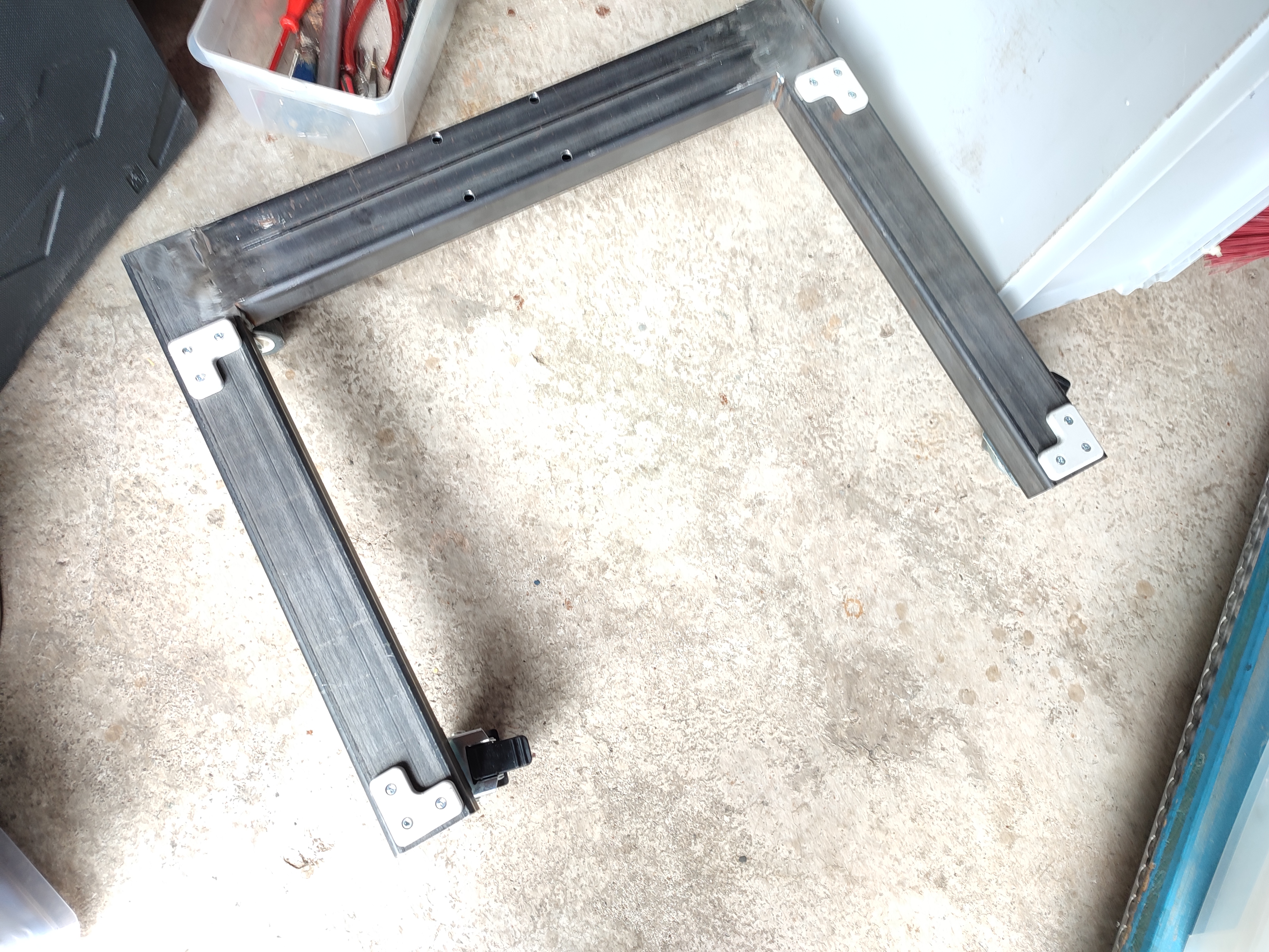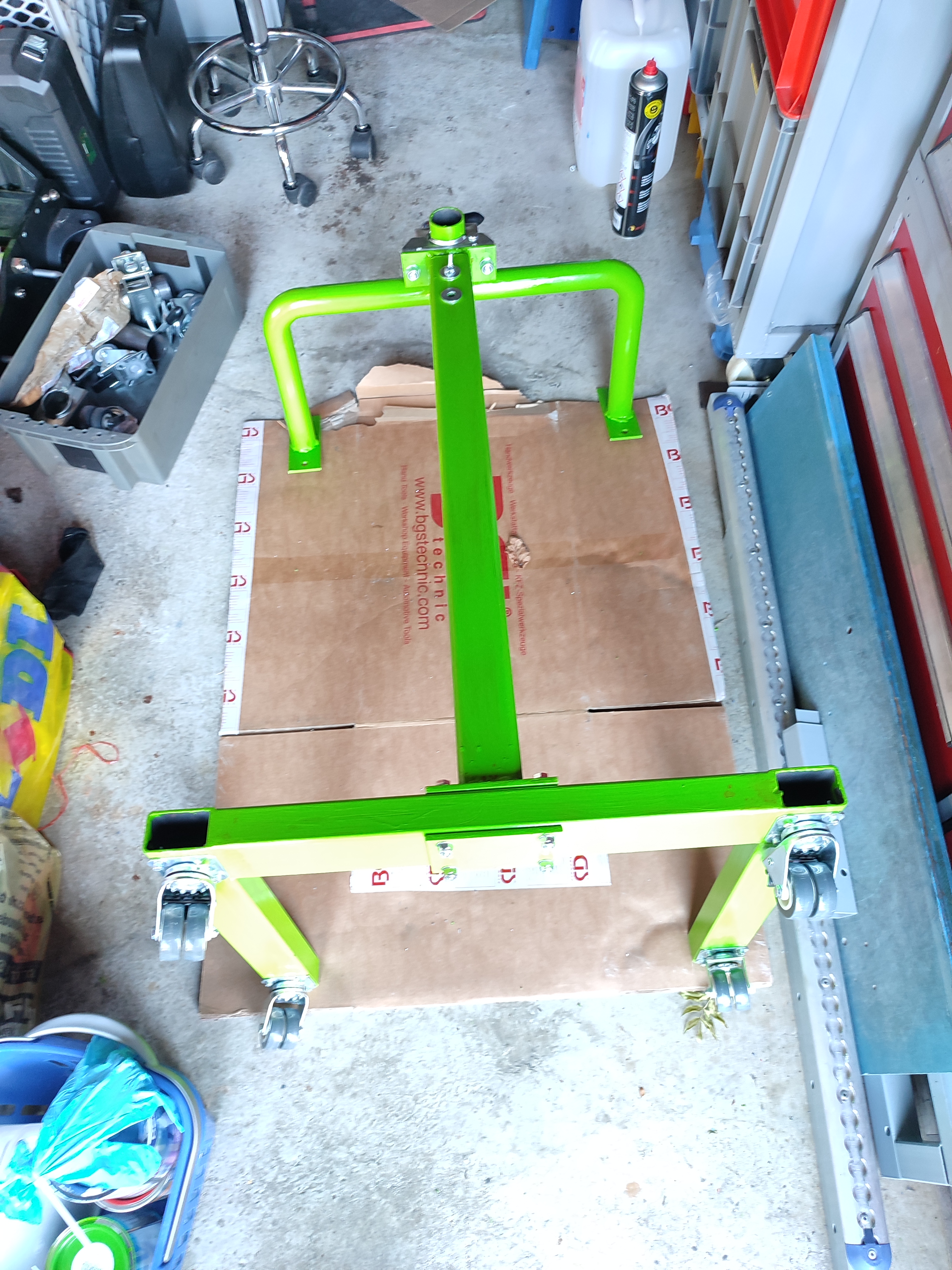 Selbstgebruzzelt, mit Senkkopfnietmuttern für die Rollen, mit 3d gedruckten, schraubbaren Ecken für die Euroboxen, höhenverstellbar, lackiert in knalliger Farbe...ich glaube ich sollte weniger Bilder von Creutzfelds Rollern etc. anschauen