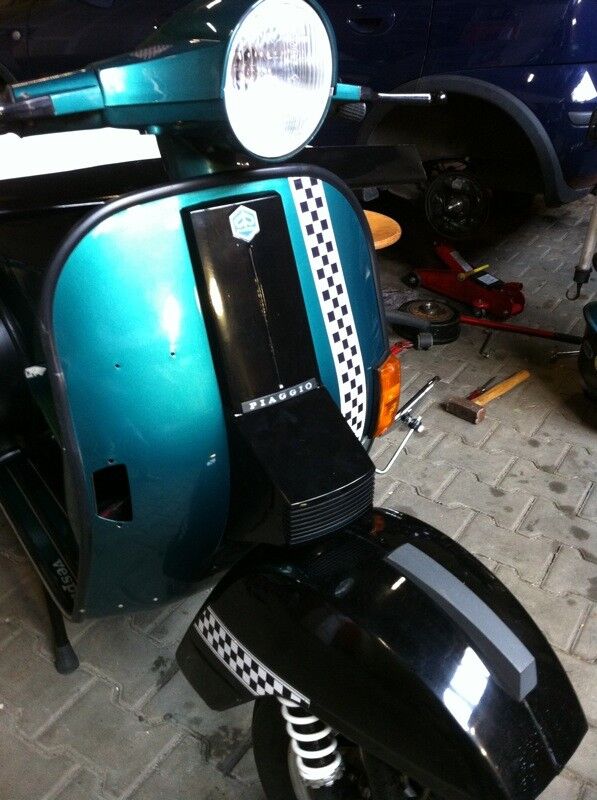 habe vor ca. 1 Monat begonnen unsere (Familienbestand) V50 auseinander zu bauen, um sie wieder flott und schick zu machen!! Da ich aber 193cm bin und einen Motorrad Führerschein habe, bin ich auf die Idee gekommen mir zusätzlich eine größere Vespa zu kaufen!! Prio 1 war sie soll einwandfrei laufen und Prio 2. sie soll als Kraftrad angemeldet sein!! Bin dann auf diese PX80 gestoßen!! Der Preis war OK und ein Scorpion Auspuff, 30iger Flachschieber und div. Kleinteile waren auch noch dabei!!! Bin super zufrieden! Die Vespa läuft echt super!! Da mir die Optik nicht ganz so gut gefallen hat, ich aber keine Lust habe die nächste Vespa für eine Lackierung auseinander zu nehmen, habe ich mich bissel ans Folieren gemacht!! Gelernt habe ich das ganze eigentlich an Autos!! Für den geringen Aufwand finde ich die Optik jetzt OK!! und wenn ich Lust und Zeit finde klebe ich ggf noch etwas weiter!! :-).. So sauber und perfekt wie an einem Auto wirds aber NIE....
