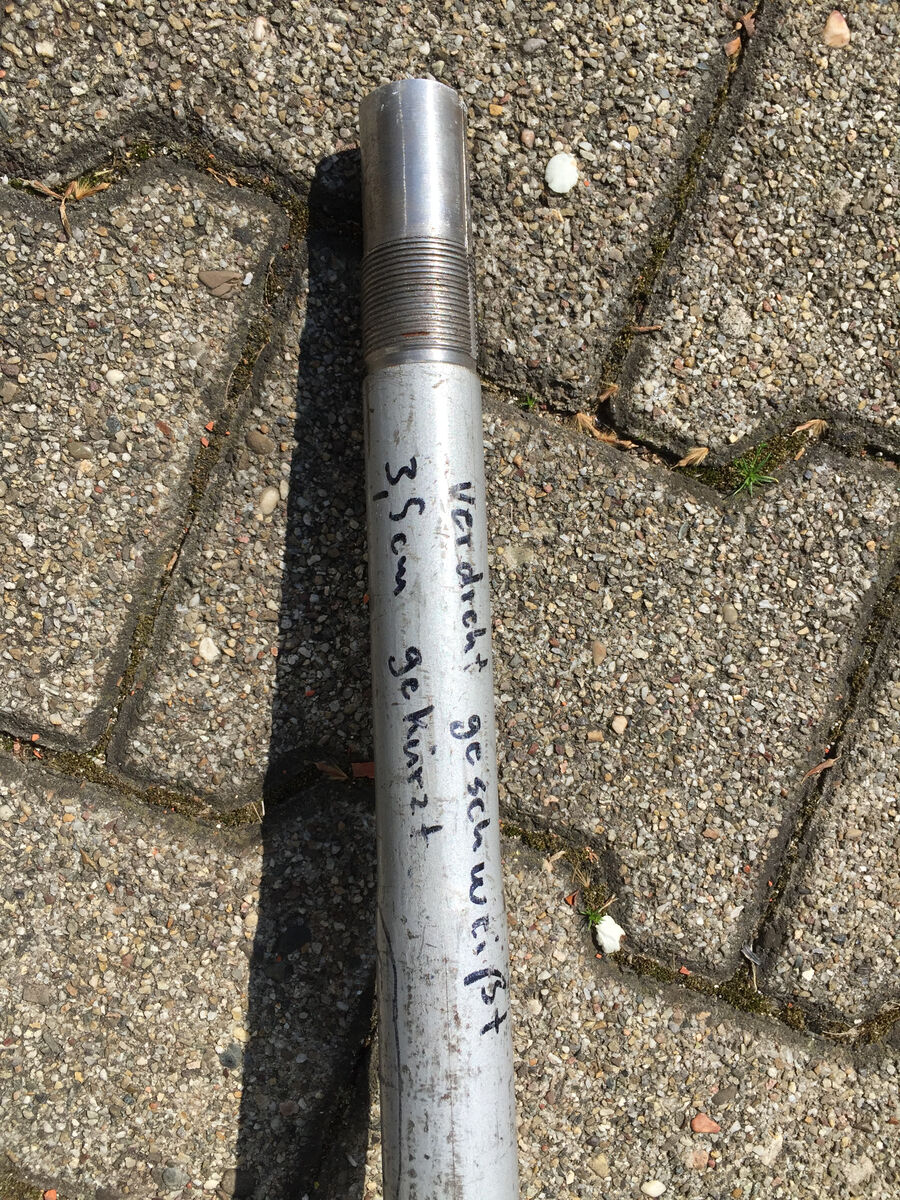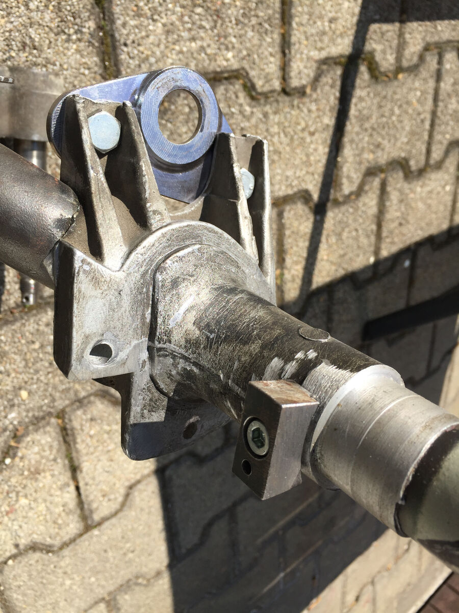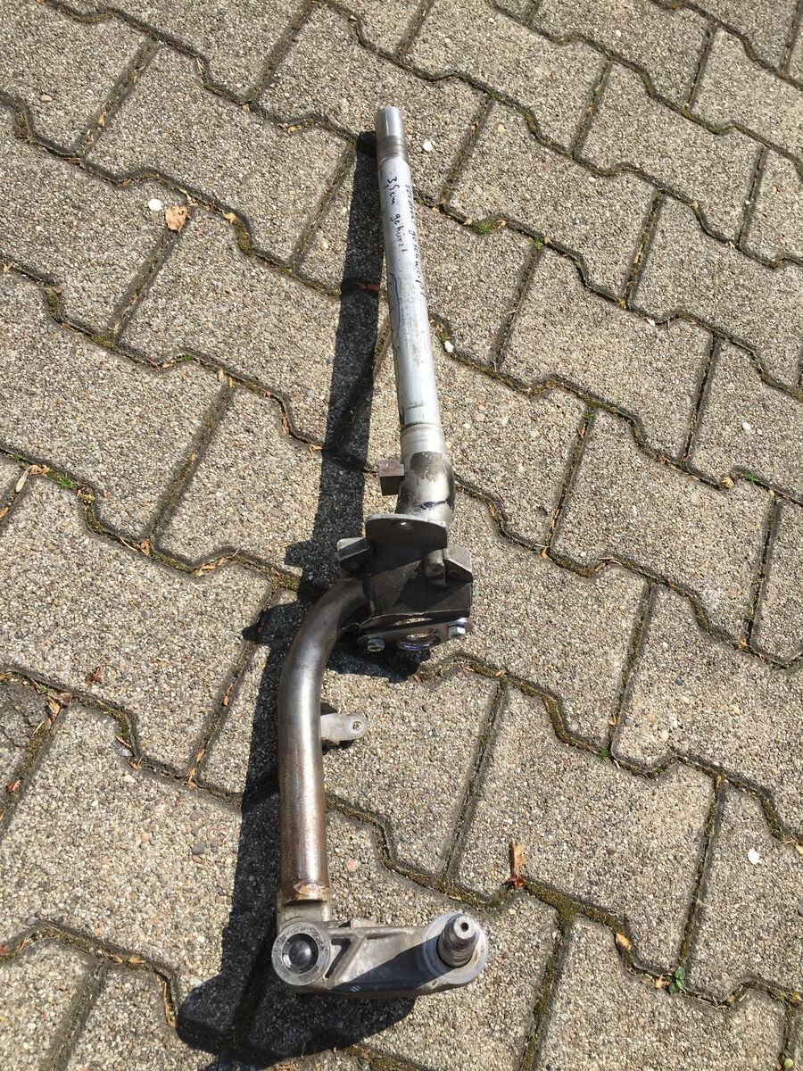 Den Umbau hat Roberto1 aus dem GSF gemacht, wirklich gute Arbeit - Roberto hat schon viele Gabeln für diverse Modelle angepasst. Gabel ist oben und unten jeweils gekürzt, Gewinde oben verlängert, Lenkschloss-Nut angepasst und Lenkanschlag unten angepasst, das ganze für möglichst wenig Spurversatz verdreht geschweißt. Schwinge unten zusätzlich überholt. Adapterplatte für 145er PK Dämpfer geb ich auch dazu.