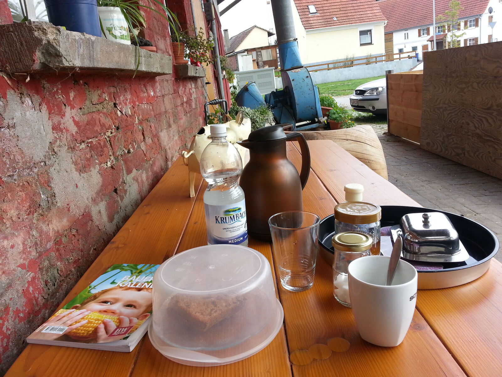 Im kleinen Dorf (irgendwo um Ulm rum) spricht sich meine Panne wohl schnell rum... so kam eine nette Frau vorbei und bot mir ein Platz (vor dem Schweinestall) in der Sonne, Kaffee und den Bauernkalender zum lesen an... so war die Wartezeit auf den Held auch ruck zuck vorbei. -