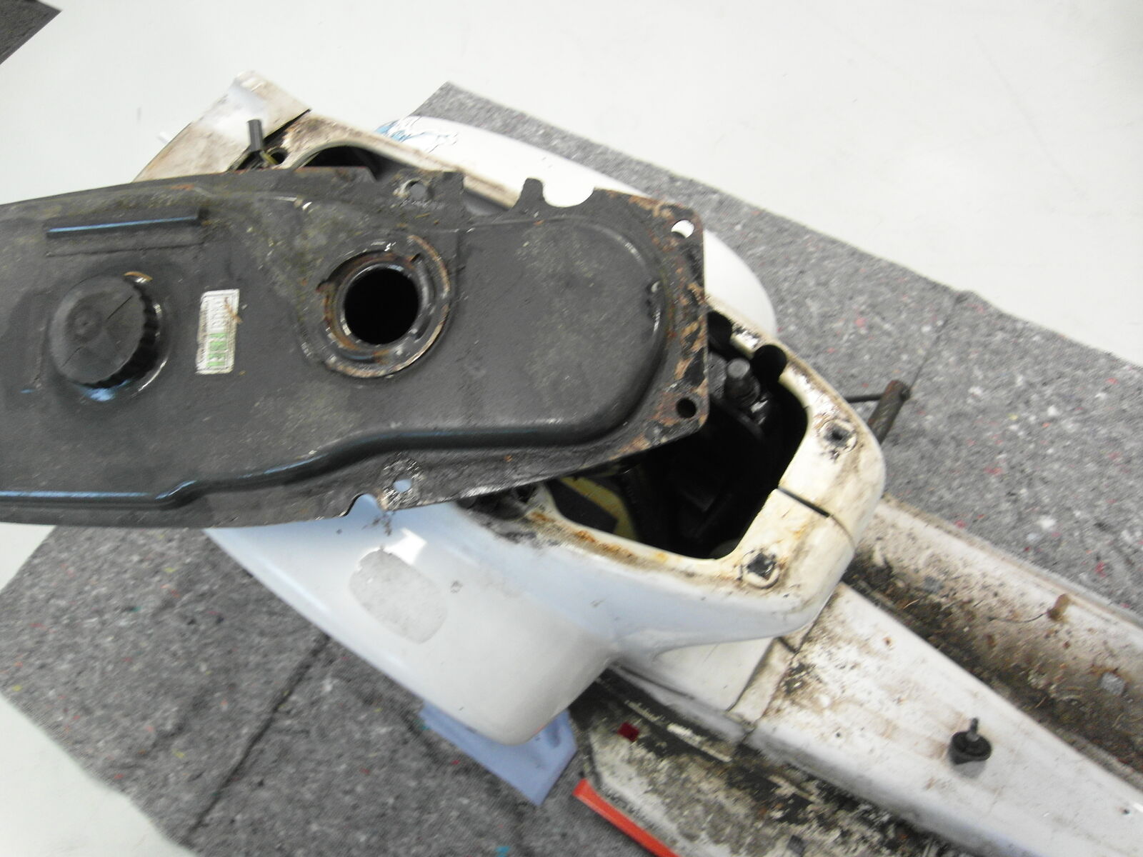um den Benzintank abzubauen, musst Du zunächst den Drehknopf vom Benzinhahn abnehmen. Dazu musst Du das "Dichtungsgummi", das hinter dem Hahn sitzt rauspopeln und den Tank oben am Rahmen schonmal losschrauben. Die Steckerverbindung zwischen Füllstandsgeber und Bordelektronik ebenfalls trennen.
