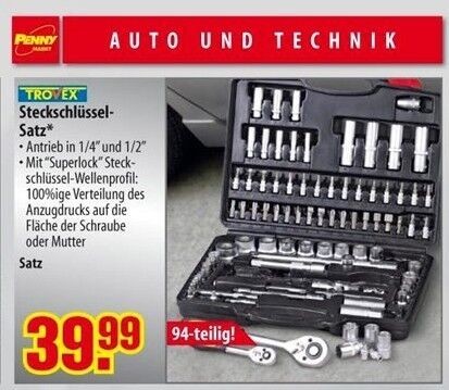 Ab Montag nächster Woche (03.11.) gibts bei Penny einen Steckschlüsselsatz für 39,99. Auch wenn's sicher nicht die allerbeste Qualität ist, kann man bei dem Preis als Hobbyschrauber sicher so viel nicht verkehrt machen, oder?