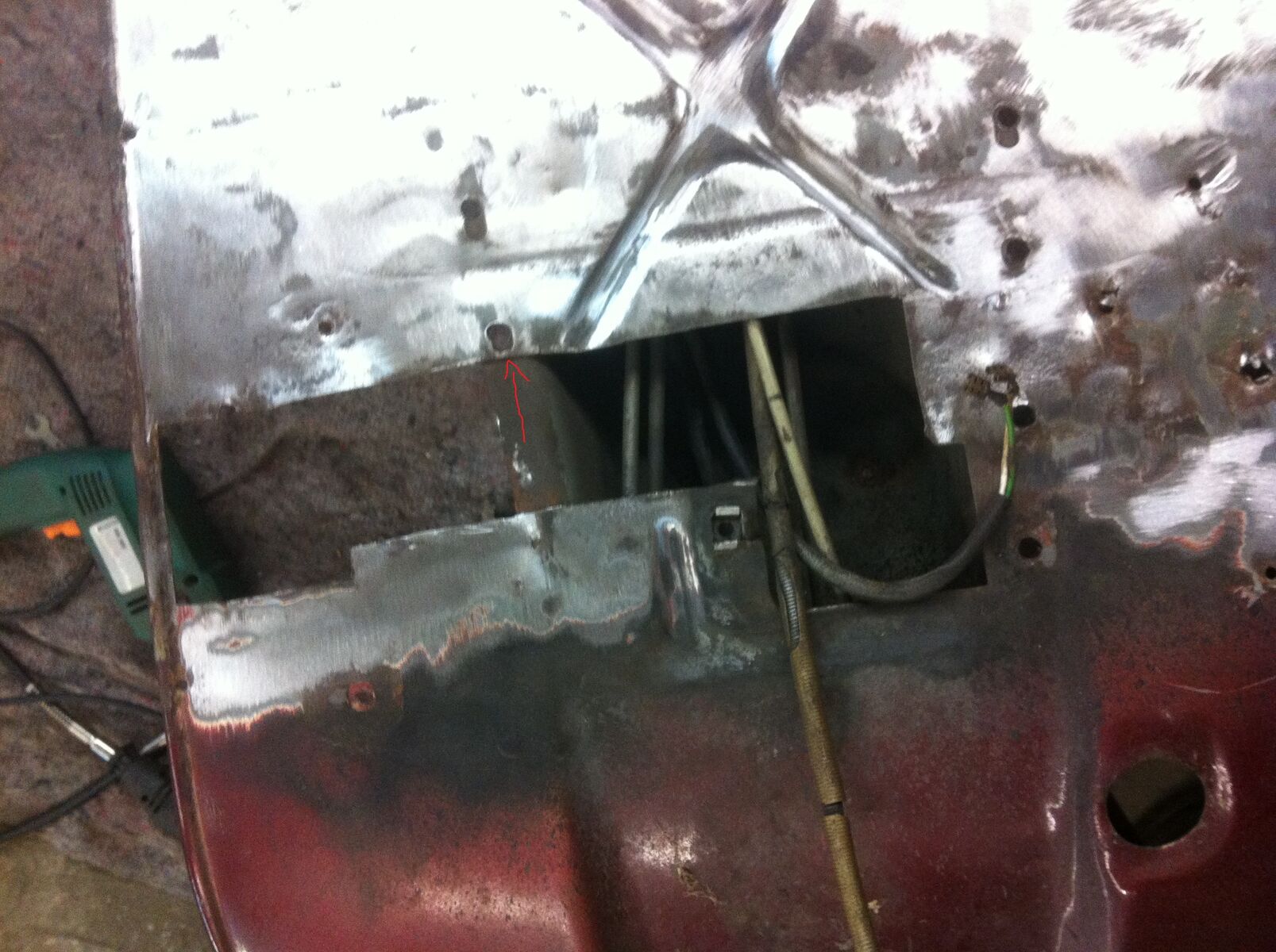 hab dieses Wochenende weitergearbeitet. Beim Bodenblech war ne Querstrebe komplett durchgegammelt, die hab ich dann entfernt und dadrunter war das blühende (Rost)Leben. Also habe ich das betroffene Blech herausgeschnitten und den Rest des Bleches blank gemacht um zu sehen ob noch mehr Blech betroffen ist. Zum Glück nicht, aber auf dem Tunnel ansatz war schon einiges an Rost (roter Pfeil Bild 3)
