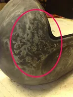 Die Rundung am Rand des Beinschildes auf der das Monoschlitzrohr sitzt die ist voll verbeult.