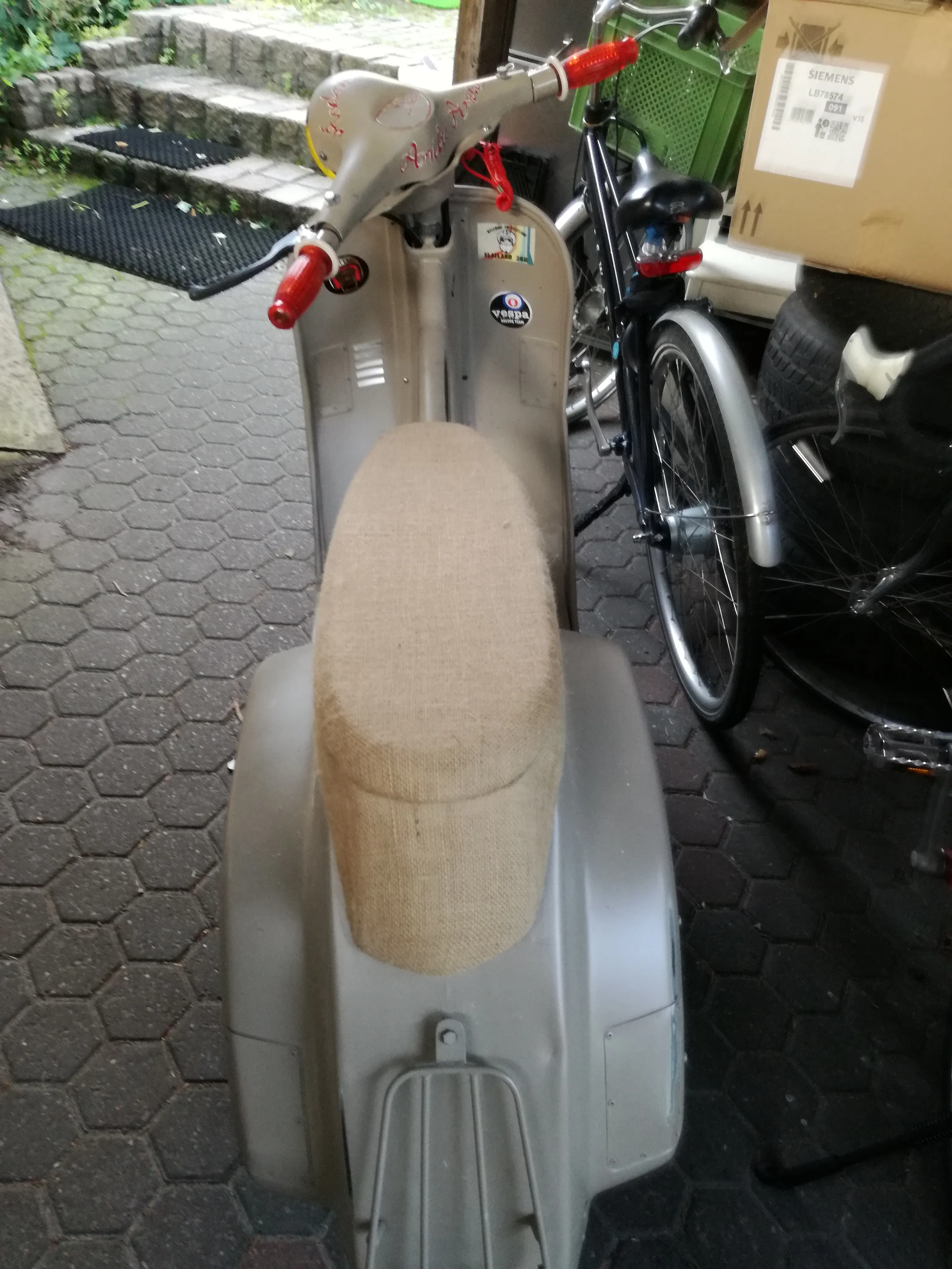 Kerze fest, frisches Getriebeöl drauf, Tank voll, fertig. Danach sofort angesprungen. Kurze Testfahrt im Garten, Kupplung trennt schon besser, bisschen noch Vergaser, Straßenbereifung drauf, fertig und fahrbereit.