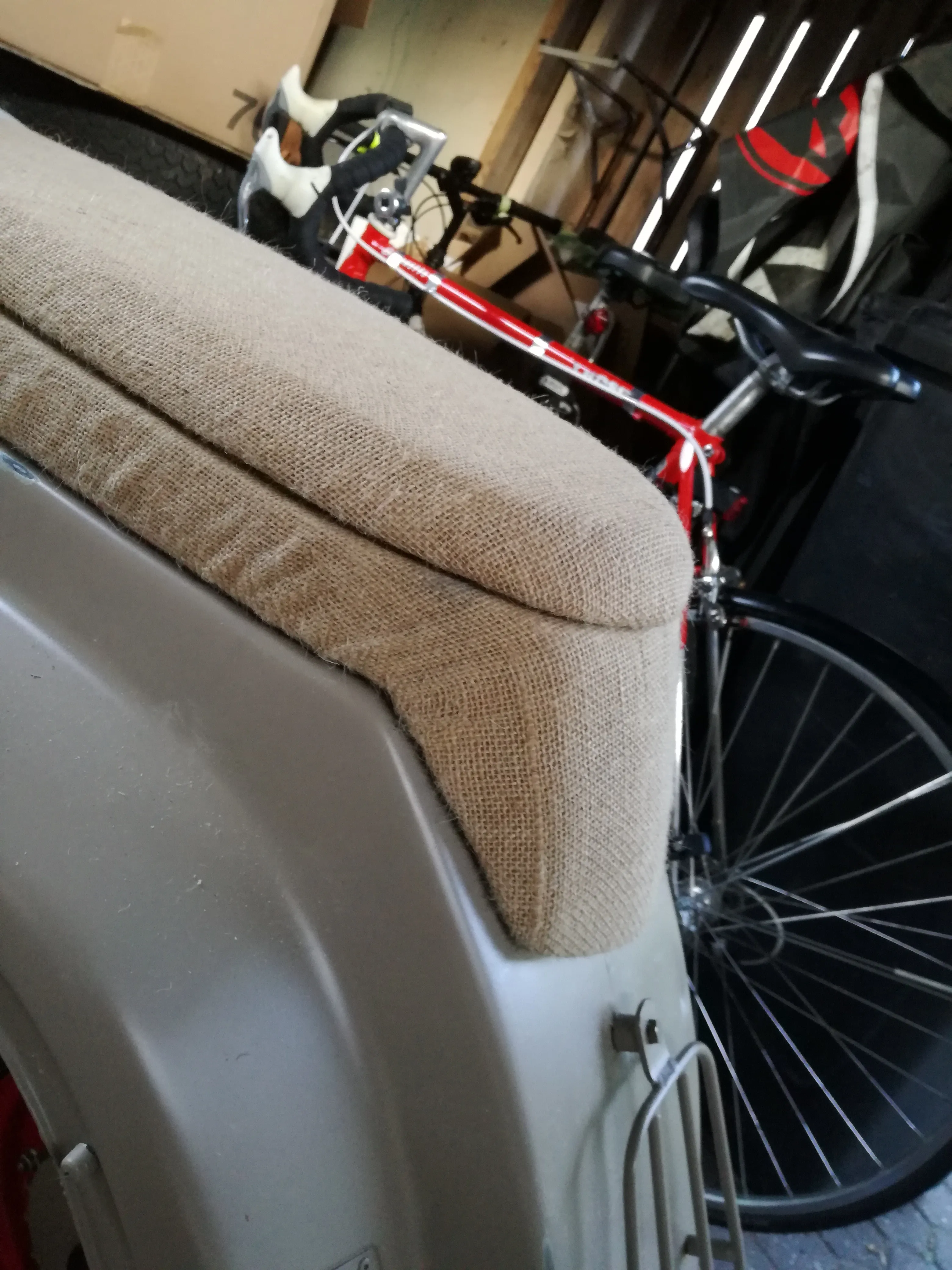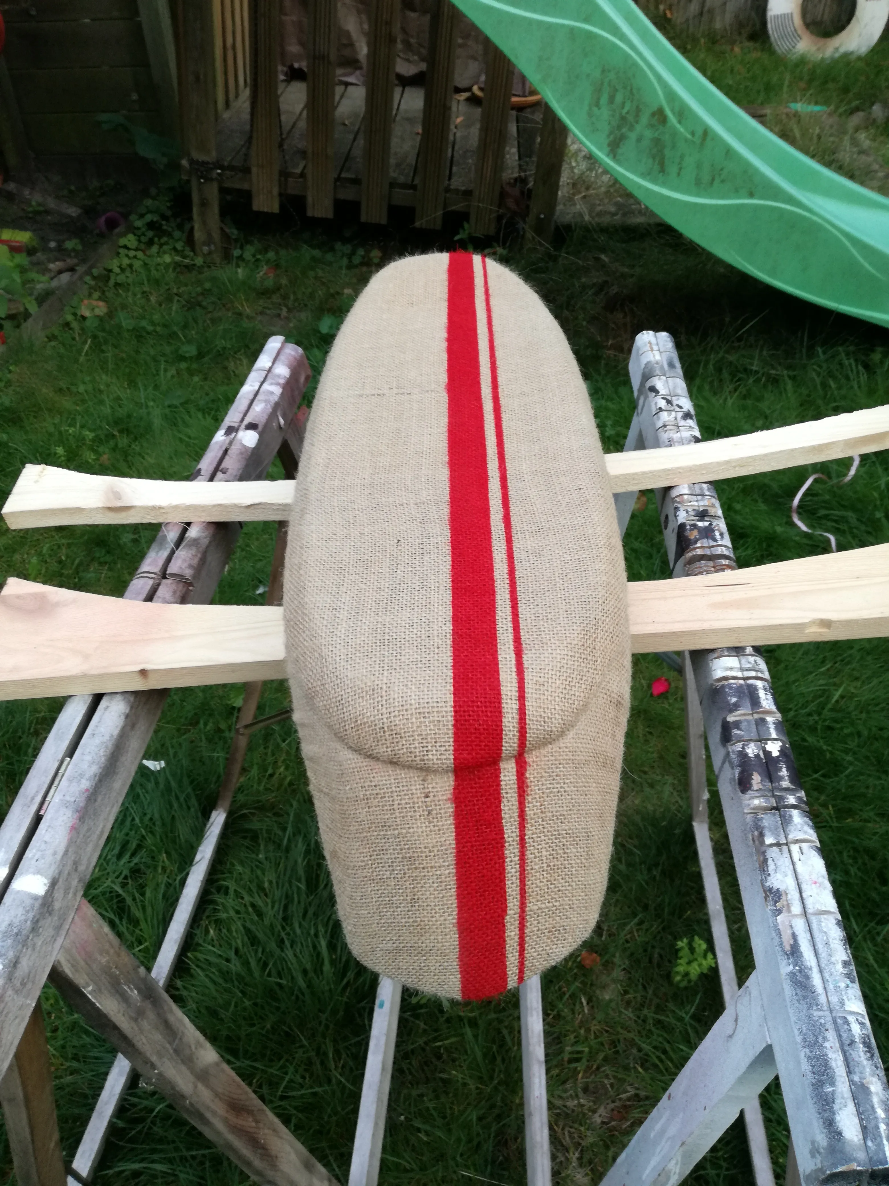 Für den Bezug steuerte die beste aller Frauen einen Jutestoff bei, den ich gedoppelt aufgetackert habe.