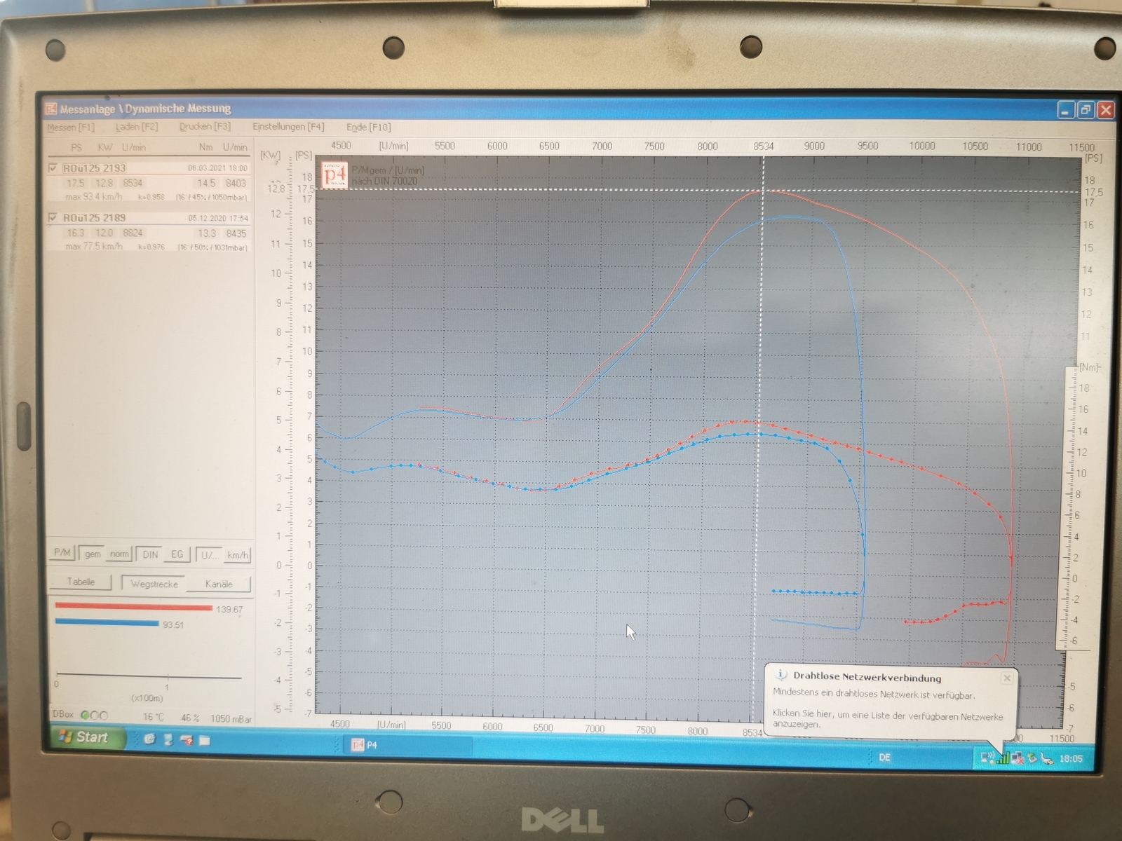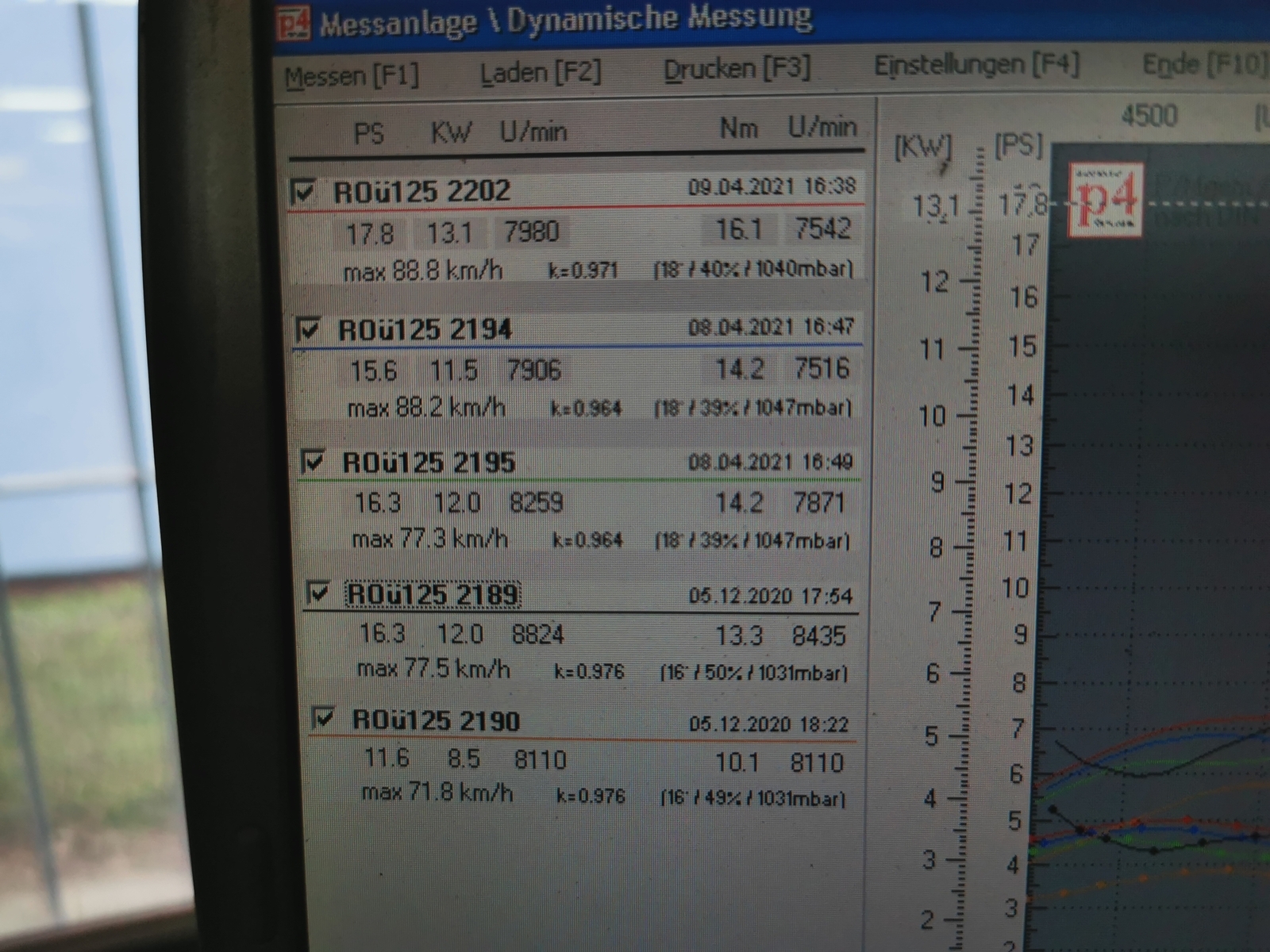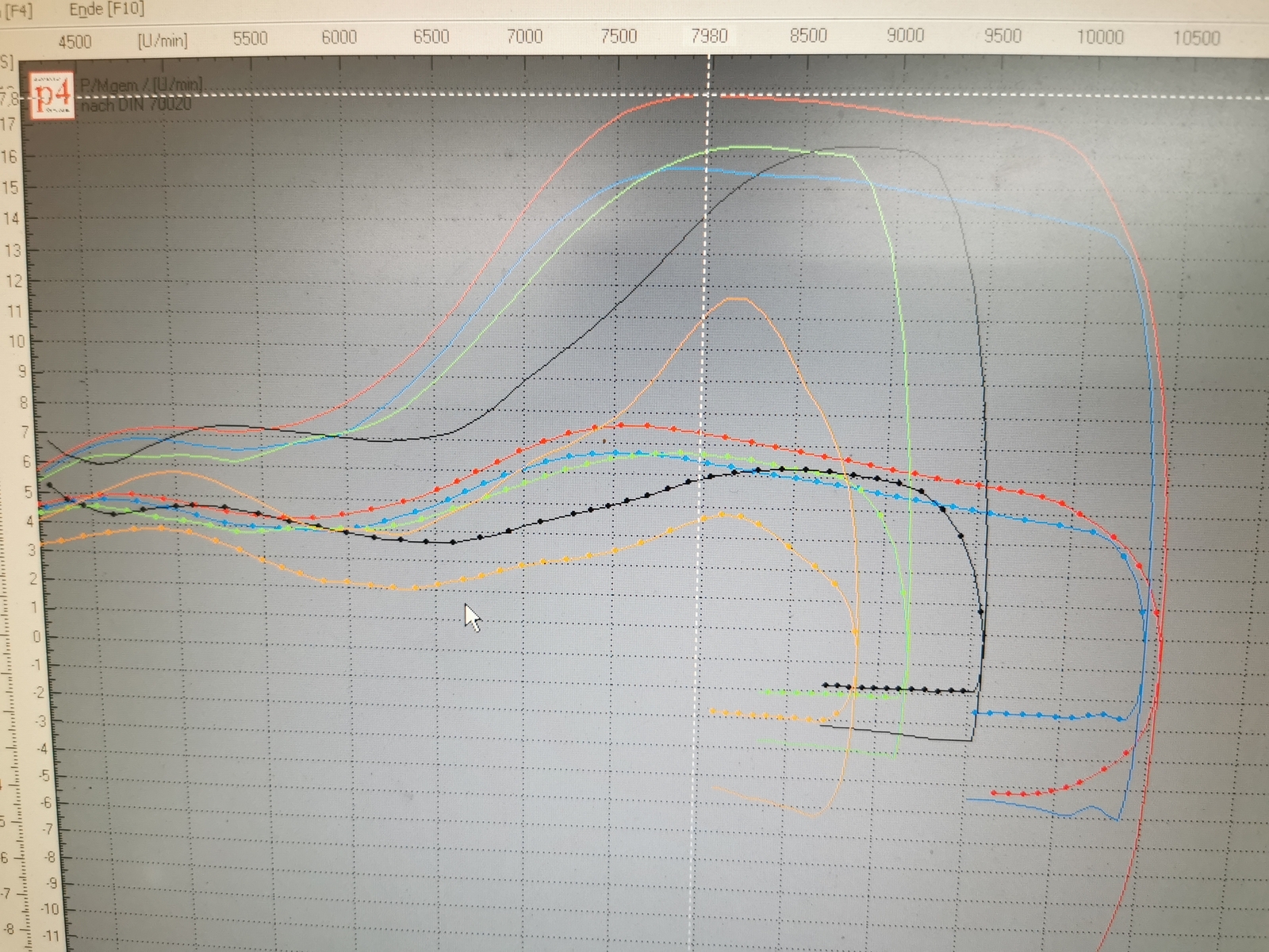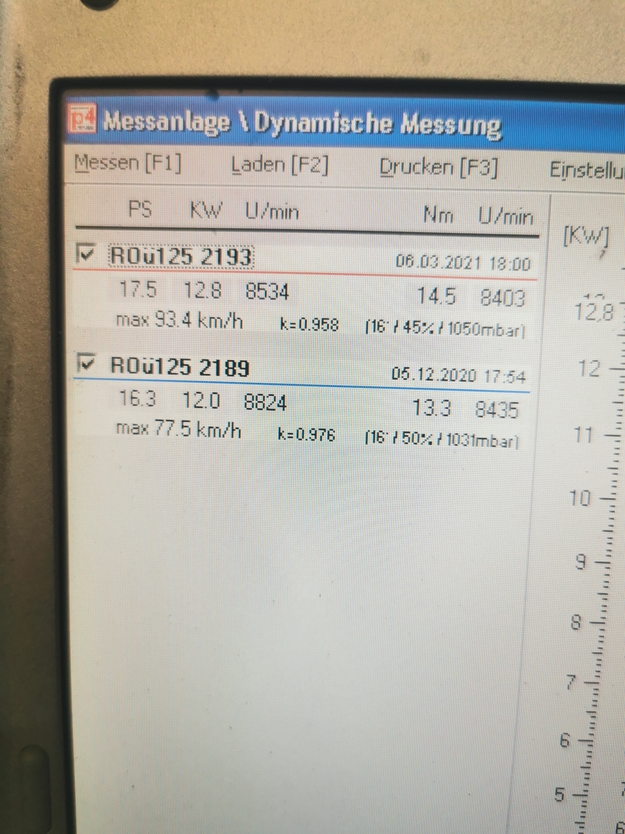 Aufgrund der hohen Steuerzeiten, so meine Vermutung, war ich an einer eventuellen Spitzenleistung leicht vorbeigeschrappt. Durch eine Kopf-statt der Fußdichtung habe ich die SZ jetzt auf ca. 128/188 herunter gesetzt.