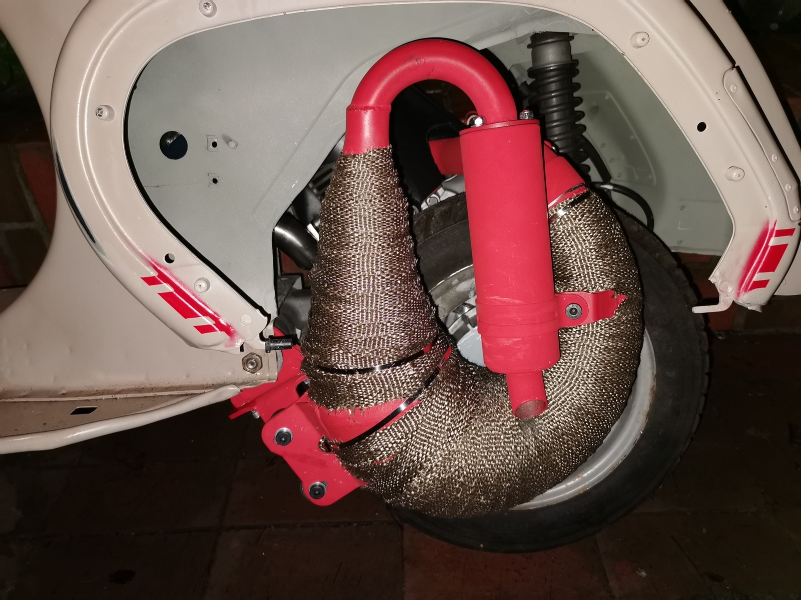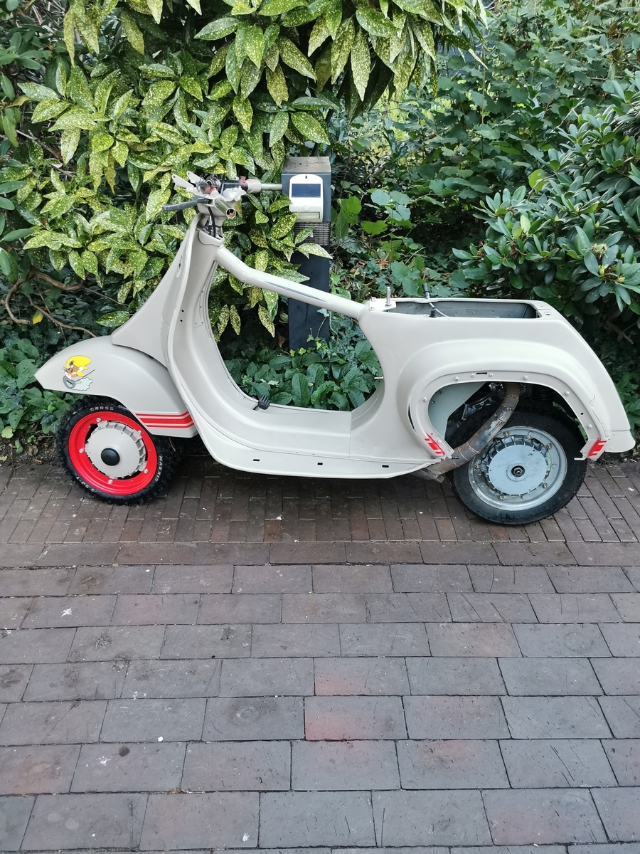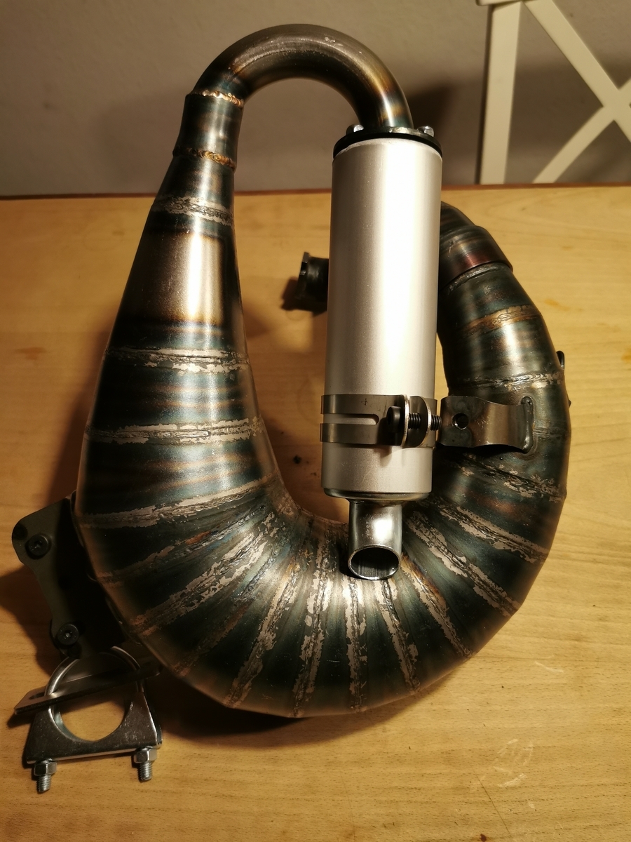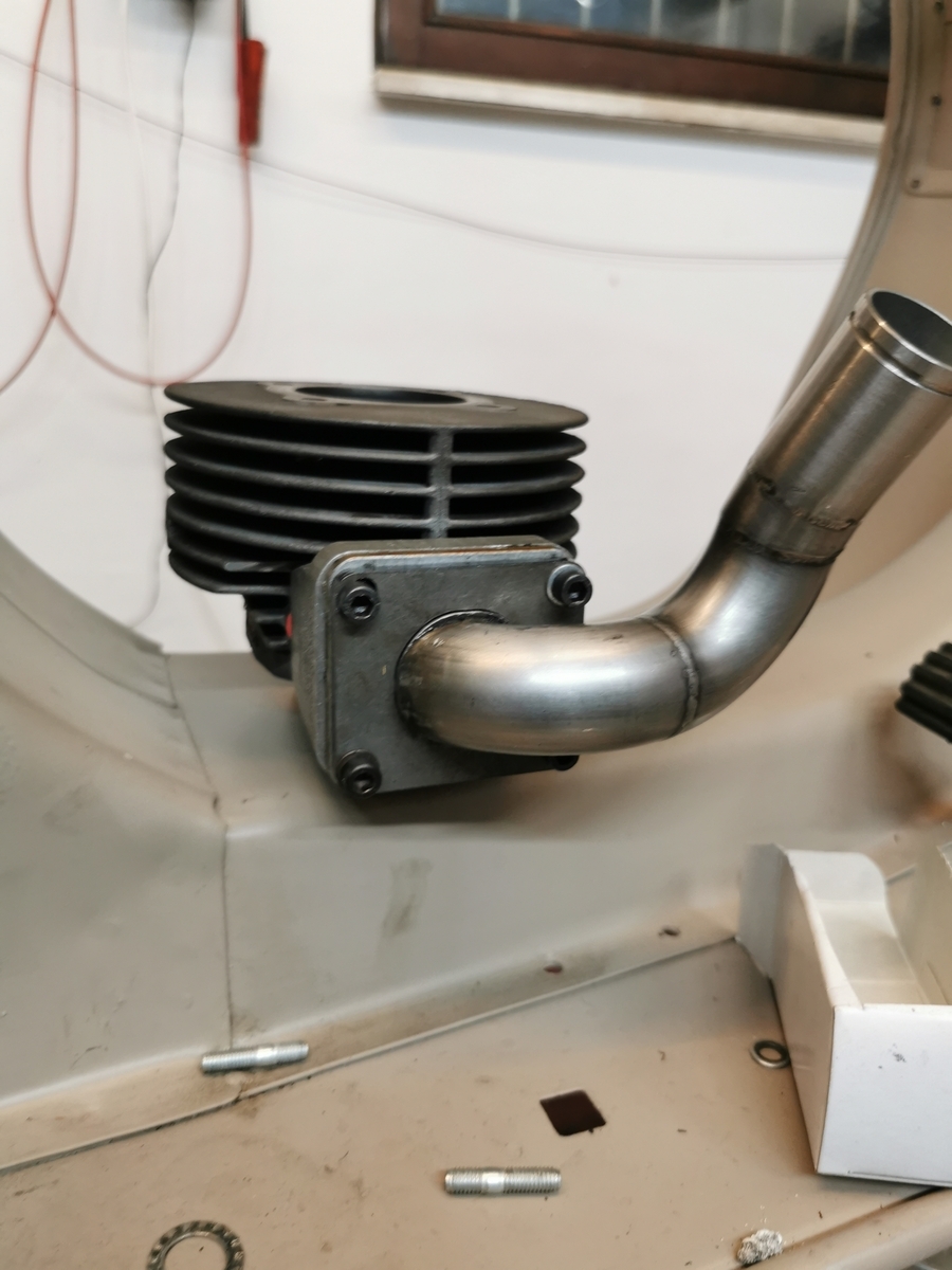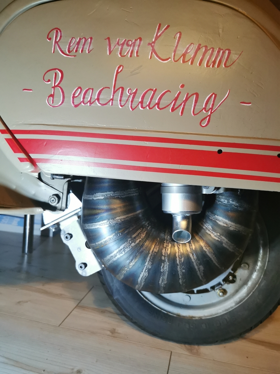 Für den first kick fehlte mir also ein Auspuff...... ich hatte noch eine Pipedesign S-Box, die ich an den Roller schraubte, mir einen 30er Mikuni lieh und die Kiste zum ersten Mal angetreten habe.