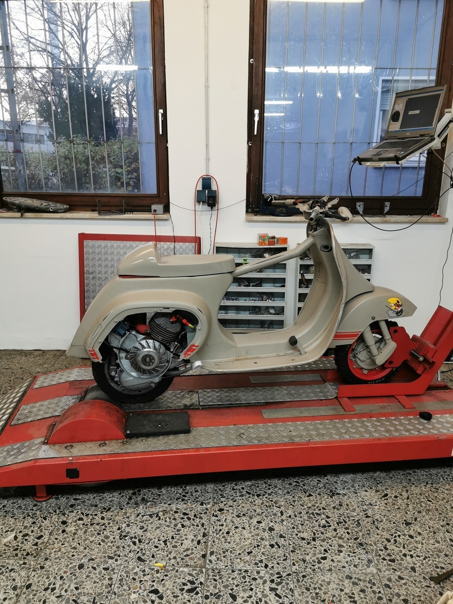 Der Motor war wieder beisammen, hatte grob eingestellt schon ein paar Mal gehustet, es ging also auf den Prüfstand
