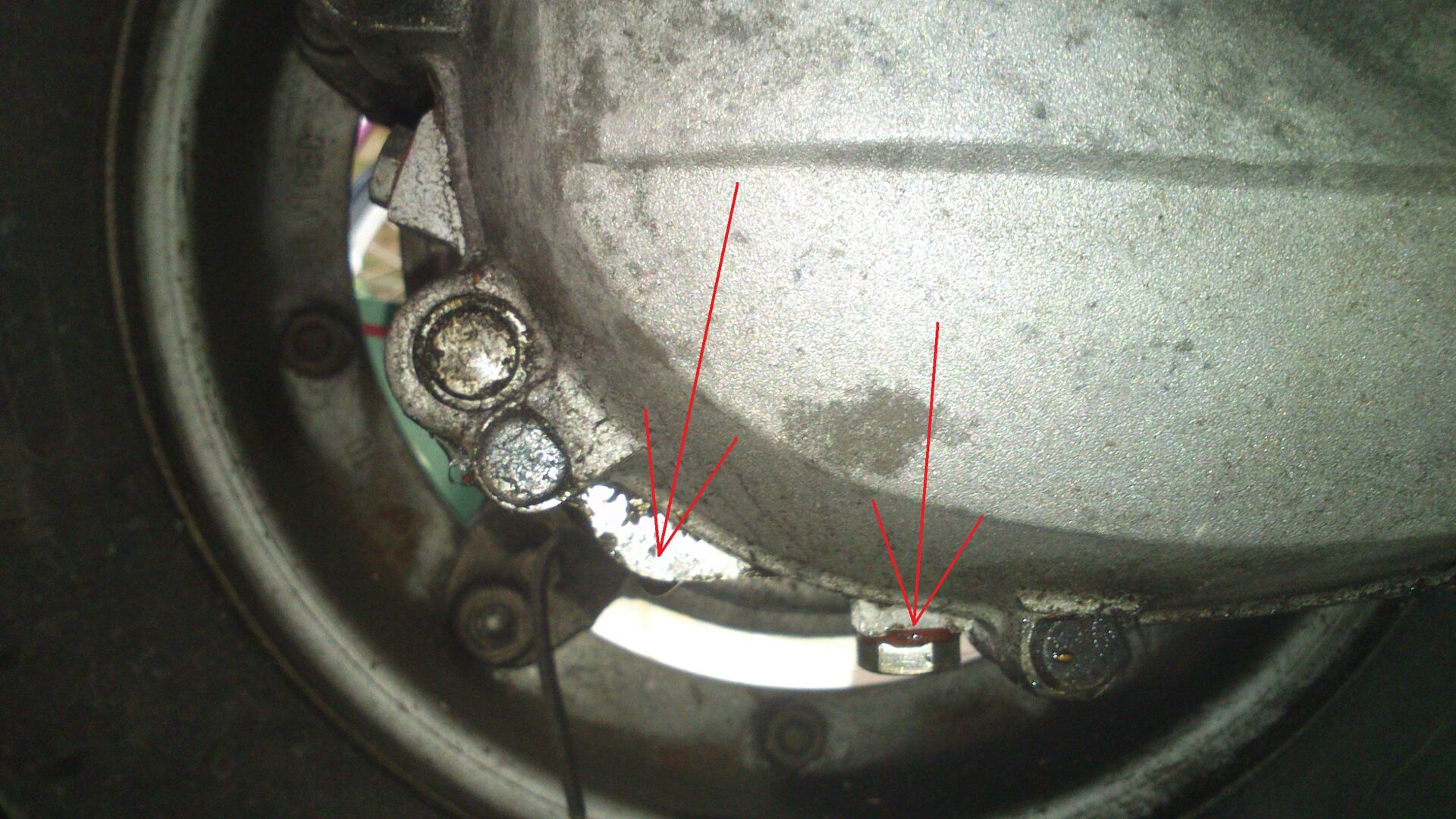 Es sei angemerkt, dass die Ölablassschraube nicht ganz dicht ist, ich habe sie letztes Jahr durch eine längere ersetzt. Es tropft nur noch selten, aber auch nicht direkt aus dem Ablassschraubengewinde (rechter Pfeil im Foto) sondern einer Stelle knapp dahinter und oberhalb (linker Pfeil). Muss da etwa der Motor gespalten und die Dichtung ersetzt werden??- Tropft es wirklich aus dem Vergaser oder event. aus dem Benzinschlauch oder dem Anschluß an Tank oder Vergaser?