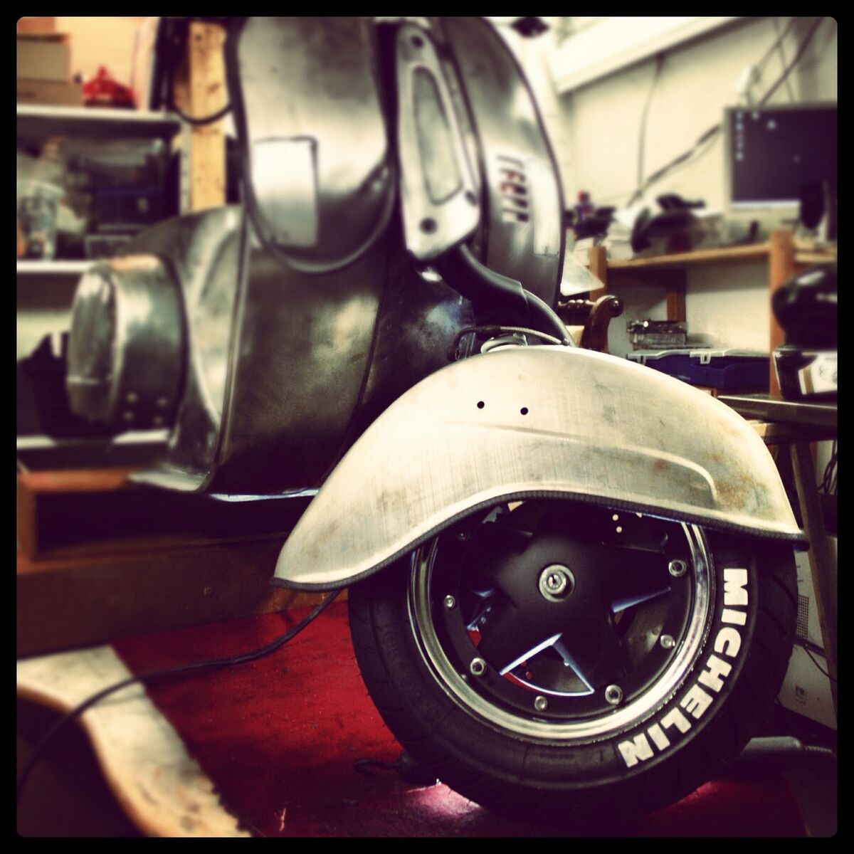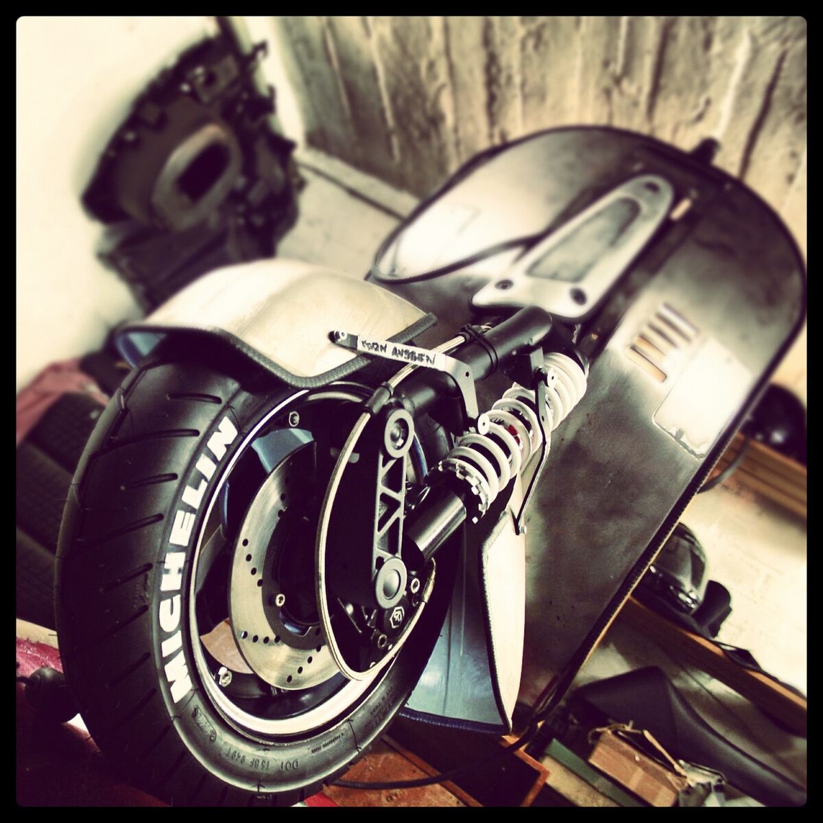 Richtig, eigentlich ist die Gabel Standard und die Bremse Serie, ich habe an der Gabel die Kotflügel-Halteplatte entfernt und viel geschliffen, auch Bremssattel und -Zylinder sind brutal unsauber von Werk, Grate, Einschlüsse und solch Späße.Für ne PK ist die Gabel etwa sieben Zentimeter zu lang, sprich kürzen ist angesagt. Auch die Nut für den Lenkradschloßbolzen müsste neu gemacht werden was bei mir wegfällt.