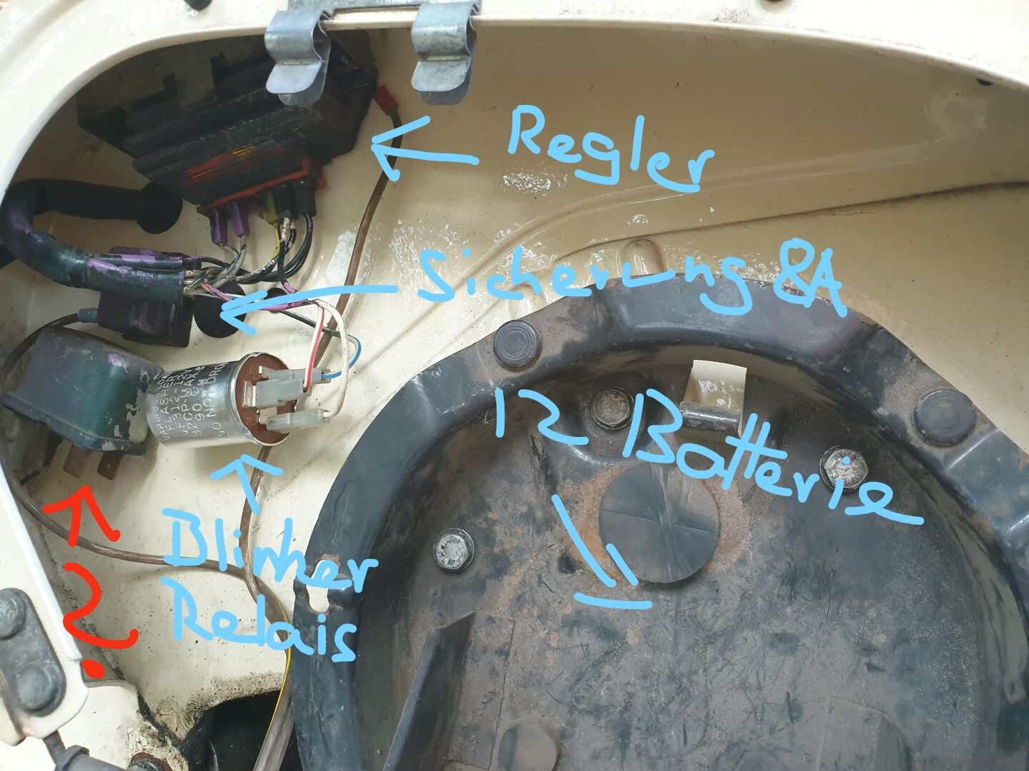 So grob kann ich die Dinge wiederfinden, aber ein Bauteil ist dabei, da weiß ich nicht wofür das ist. Ich habe das Bild mal angefügt. Kann mir das jemand sagen? Wofür ist das gedacht? (siehe das Fragezeichen auf dem Bild... hat die Hupe nochmal einen extra Schalter/Kondensator?)