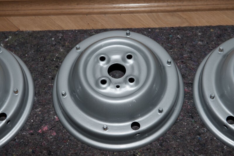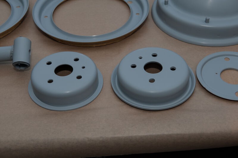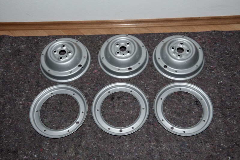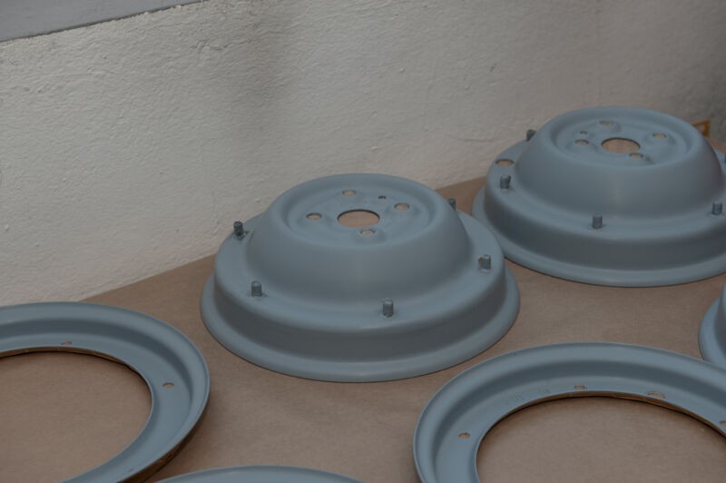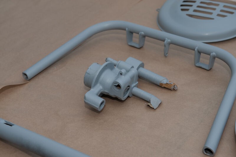die gestrahlten Fahrwerksteile in der Lackierkabine, die etwas dunklere Farbe kommt vom Säurebad, in dem sie noch zum entrosten waren. In ein paar Rostporen meinte man noch verbliebenen Rost erkennen zu können, da war das Säurebad als Sicherheit gedacht.