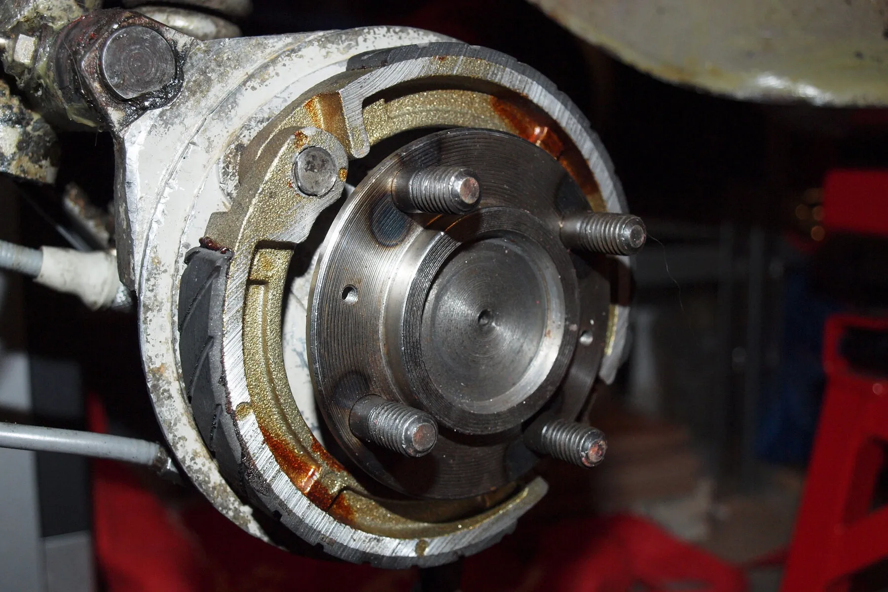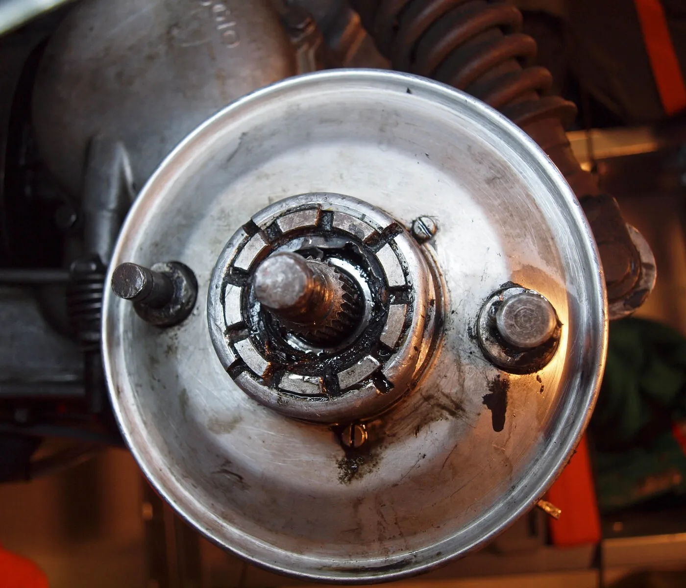 6.) Neuer Dämpfer war da und wurde getauscht. Ging nicht ohne die Hilfe vom Frauchen, da der Dämpfer zwei Nippel hat, die in der richtigen Position in die Dämpferaufnahme unten gedrückt werden müssen (siehe rote Punkte). D.h. der Dämpfer muss ein Stück ein federn (zusammengedrückt werden) damit man es mit nem Gummihammer rein bekommt. Oben hat sich der Dämpfer auch etwas gewehrt (hatte ich als erstes gemacht), aber mit etwas WD 40 konnte ich den dann von Hand rein drücken.