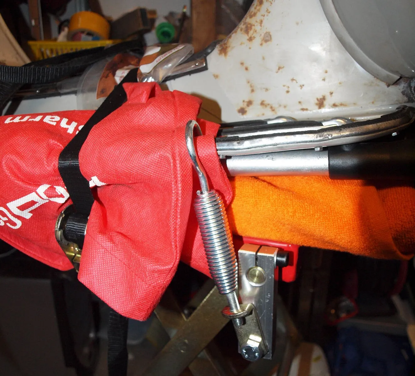 11.) Tank ist ja noch draußen, da ich den versiegeln werde usw. Habe dann bei der Gelegenheit mal einen Benzinfilter an die gerade Stelle des Tanks eingebaut, schaden wird das sicher nicht, oder? (Wer sich über das gelbe Zeug wundert, das ist Fluid Film)