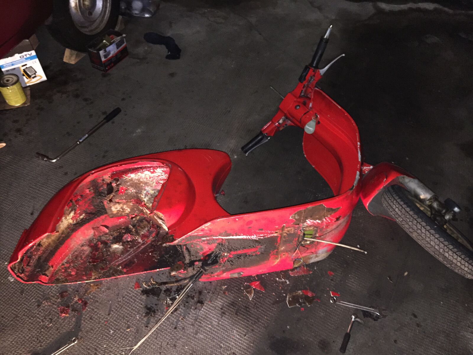 Dann habe ich hier und da mal geschubbert an der Vespa. Unter dem Spachtel am Heck habe sich zwei Löcher versteckt...