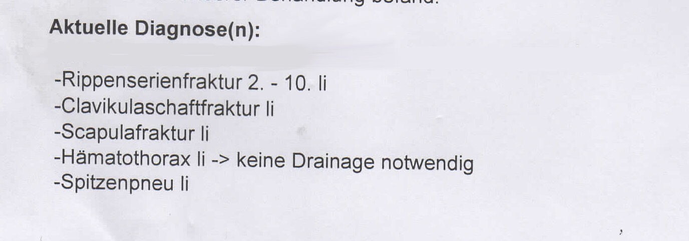 wow die Karre sieht ja schlimm aus, Glück gehabt. In der Diagnose bedeutet der Spitzenpneu übrigends nicht das ich ausserordentlich gute Reifen drauf hatte ;-), sondern bezieht sich auf meine angestochene Lunge. Neben mir lag einer der ist über sein Fahrradlenker geflogen, dem haben Sie auch gleich die MIlz entfernt. Da bekommt der Spruch zwischen Leber und Milz passt noch nen Pils ne ganz andere Bedeutung, wobei da jetzt eigentlich ja viel mehr Pils zwischen passen müßte